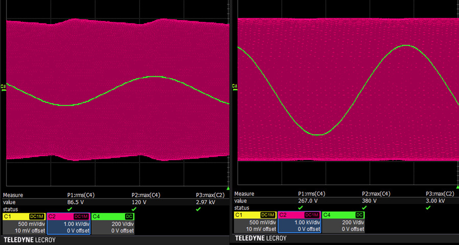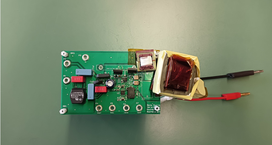 Ergebnis: Die Messungen am Prototyp haben gezeigt, dass die meisten Anforderungen erfüllt werden können. Sie ergaben eine Ausgangsspannung von 1-3 kV bei einer Ausgangsleistung von 20 W und einem niederfrequenten Ausgangsspannungsrippel kleiner als 15%. Nicht erfüllt werden konnte die maximale Bauteiltemperatur. Die Spule und der NTC Widerstand wurden beide 7-10 °C zu warm. Die vorliegende Arbeit zeigt dennoch auf, dass die Wandlung von 85-265 VAC zu 2.7 kVAC mit einem Parallelresonanzwandler machbar ist. Weiter zeigt die Arbeit auf, was bei dem Wickeln eines Transformators mit 2.7 kV und 50-200 kHz AC zu beachten ist.
