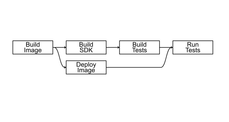 Anschliessend wird das Image auf einer Testplattform bereitgestellt und gestartet. Gleichzeitig wird das SDK und die spezifischen Tests für das Zielsystem auf dem Build-PC erstellt. Um zu überprüfen, ob die Images korrekt funktionieren, werden die Tests auf dem Zielsystem ausgeführt und die Testergebnisse gespeichert. Aus diesen Ergebnissen wird nach jedem Testlauf ein Testbericht erstellt, um zu überprüfen, ob die Tests erfolgreich verlaufen sind. Im Falle eines gescheiterten Tests schlägt die Pipeline fehl und der Entwickler muss den Fehler beheben.