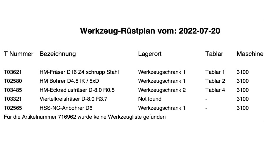 Das System zur Werkzeugverwaltung und Optimierung des Maschinenrüstprozesses soll die Standzeiten der CNC-Maschinen reduzieren. Diese Optimierung basiert auf einer Effizienzsteigerung im unorganisierten Rüstprozess. Dieser Ablauf soll durch einen Rüstplan unterstützt und geführt werden. Dieser Plan enthält alle zu rüstenden Werkzeuge sowie ihren aktuellen Lagerort und die Maschine, bei der sie gebraucht werden. Um diesen Plan zu generieren, wurde eine Java-Applikation entwickelt, welche alle benötigten Daten aus verschiedenen Datenbanken lädt, sie aggregiert und daraus ein PDF und CSV- Dokument generiert. Dabei kann konfiguriert werden, von wo welche Daten abgerufen werden sollen. Für die Verwaltung der Werkzeuge wurde eine Python-Applikation auf einem RaspberryPi implementiert, an den ein Barcodescanner angeschlossen ist. Mit diesem Scanner können die Werkzeugnummern gescannt werden, welche dann anschliessend in eine Datenbank geschrieben werden. Somit wird der Werkzeugbestand in den Werkzeugschränken durch die Datenbank abgebildet und diese Daten können dann von der Java-Applikation für die Generierung des Rüstplans abgegriffen werden.