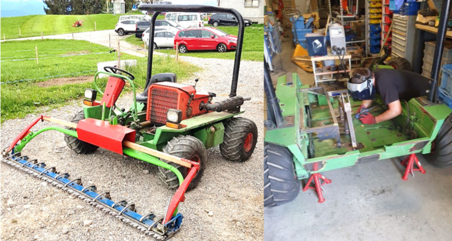 Einleitung: Ein fast 40-Jahre altes Mähfahrzeug soll elektrifiziert werden. Es handelt sich um einen Rasant Berg Trak 802 mit tiefem Schwerpunkt und enormer Geländegängigkeit. Angetrieben wird das Gerät über einen 3-Zylinder Dieselmotor. Die Kraftverteilung auf Räder und Zapfwelle erfolgt vollmechanisch. Speziell an der Maschine ist die Lenkung. Alle vier Reifen sind starr über Achsgetriebe aufgehängt. Die linken und rechten Räder sind jeweils über eine Antriebskette verbunden. Gelenkt wird das Fahrzeug über eine Panzerlenkung. Mit zwei Lenkbremsen wird entweder die linke oder die rechte Antriebsseite abgebremst. Das Lenkverhalten der Maschine ist nicht zufriedenstellend, da die Lenkbremsen sehr anfällig auf Feuchtigkeit sind. Zudem verliert das Fahrzeug durch den Drehmomentverlust beim Lenken seine Steigfähigkeit. Aus diesen Gründen ist das Gerät nicht effizient im landwirtschaftlichen Bereich einsetzbar.