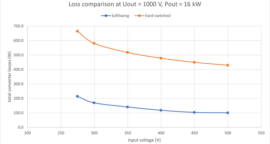 Ergebnis: Die spezifizierte Ausgangsleistung von 18 kW wird bei nominalen 400 V am Eingang mit einem Wirkungsgrad von 99% erreicht. Verglichen mit der gleichen Leistungszelle bei hartschaltender Ansteuerung bedeutet das eine Reduzierung der Konverterverluste von 75%. Auch bei Eingangsspannungen von 275 V bis 500 V, wie sie in Brennstoffzellenanwendungen bei Schwerlastwagen üblich sind, kann man eine Verbesserung der Effizienz um etwa 2% beobachten. Ein Weiterentwickeln des SoftSwing®-Designs unter Verwendung von SiC-Halbleitern bringt somit für den Markt an DCDC-Wandler attraktive Vorteile.