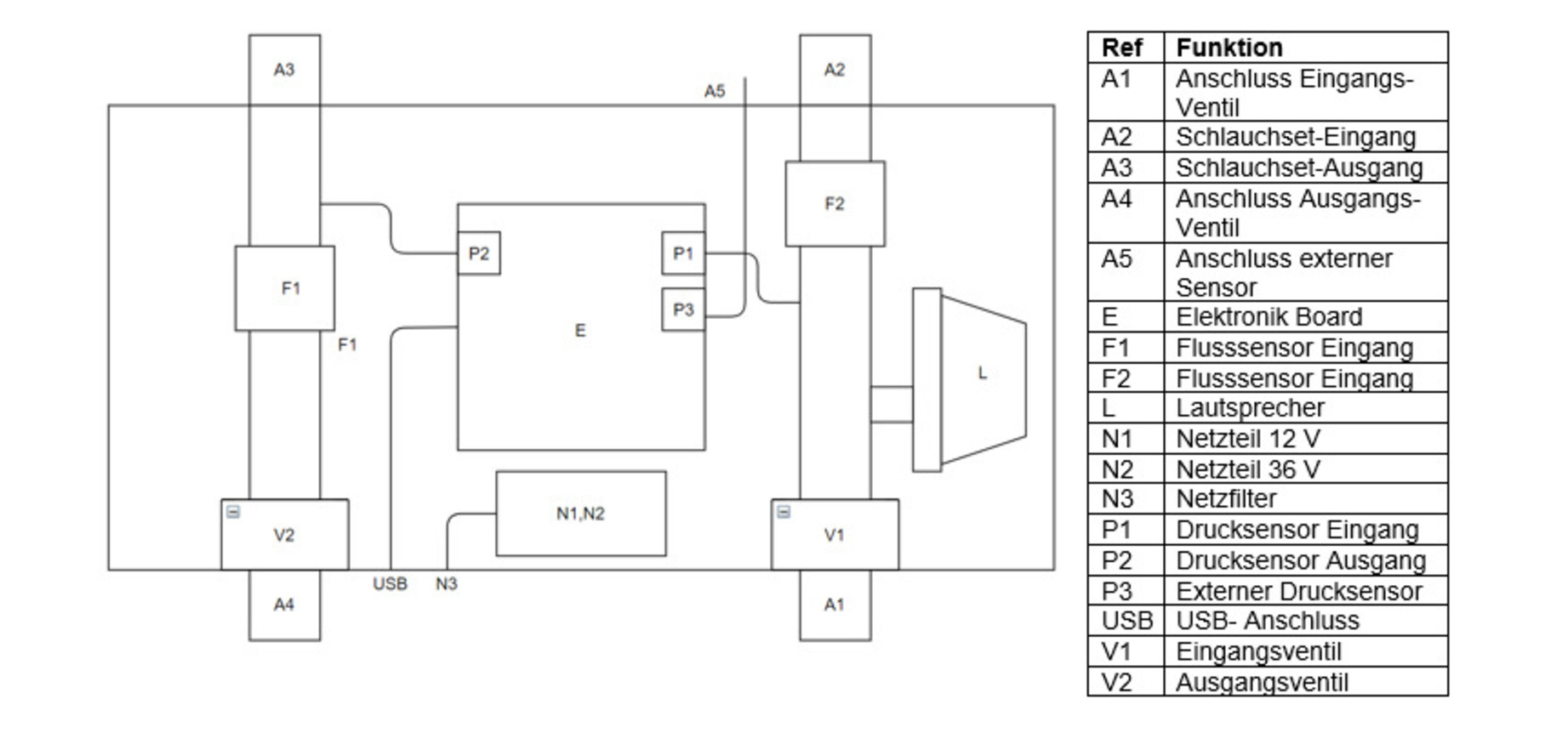 Vorgehen / Technologien: Die erarbeitete Lösung besteht aus einem Lautsprecher und verschiedenen Druck- und Durchflusssensoren. Die grundsätzliche Idee besteht darin, das zu messende Schlauchsystem mit Druckänderungen von verschiedenen Frequenzen anzuregen und das Verhalten vor und hinter dem Messobjekt zu messen. Dazu wird auf beiden Seiten je ein Druck- und ein Flusssensor angebracht.