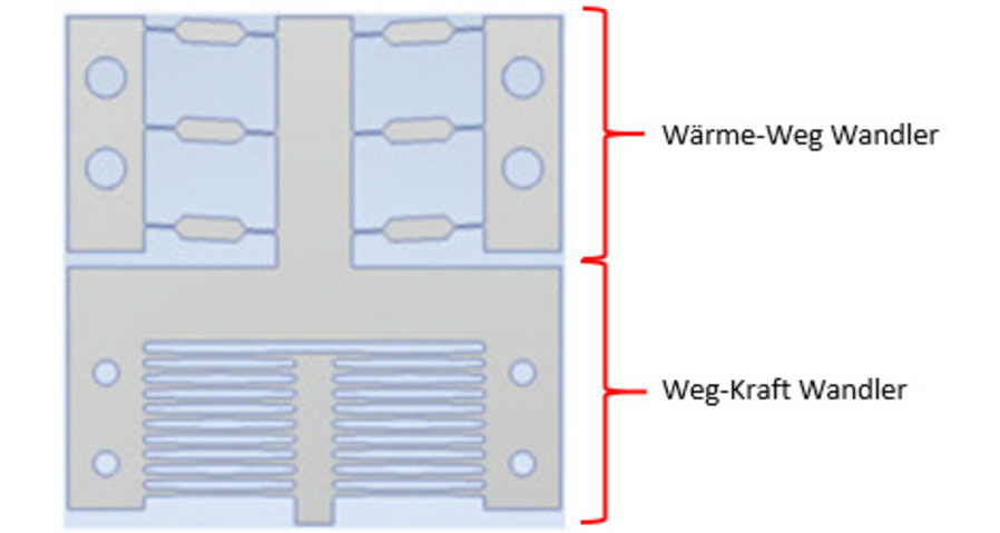 Ergebnis: Mit Hilfe der Konzeptauswertung wurde das Konzept eines thermischen Aktors entwickelt, einem sogenannten Chevron-Aktor. Durch die vorhandene Wärmeenergie wird der Chevron Aktor bis auf 360 °C erhitzt und durch die Ausdehnung des Materials wird eine Bewegung von bis zu 2 mm erzeugt. Damit konnte die Wärme in Bewegung umgewandelt werden. Als zweites Teilsystem wurden Balkenfedern verwendet, welche die Bewegung in Kraft umwandeln.