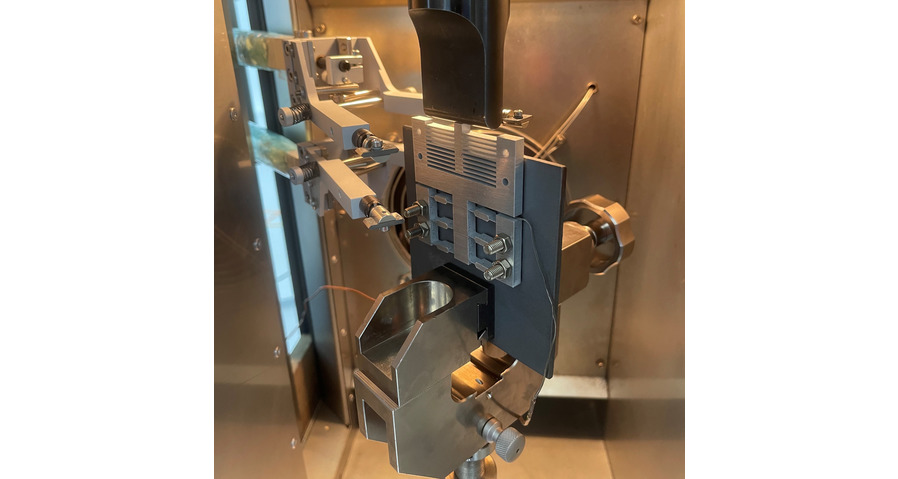 3. Das Gesamtsystem (thermische Klemme) wurde mittels einer Druckprüfanlage ausgemessen, wobei die Vorrichtung im beheizbaren Probenraum bis auf 240 °C erwärmt wird und die Kraft gegenüber der Bewegung aufgezeichnet wird.