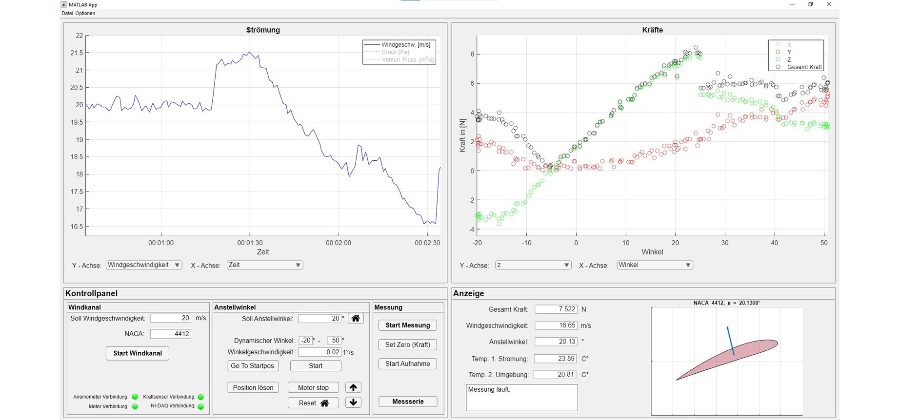 Ergebnis: Aus diesem Grund wurde im Rahmen dieser Arbeit ein neues Messkonzept implementiert und die Messung automatisiert. Die zu bearbeitenden Arbeitspakete waren: Ausmessen des Strömungsprofils; Verbesserung mittels Leitelementen; Entwicklung des Messaufbaus; Schnittstellenanalyse der Aktoren und Sensoren; Messdatenerfassung und Programmierung der Bedienersoftware. Der Aufbau beinhaltet eine Positionssteuerung des Flügelanstellwinkels, eine Geschwindigkeitsregelung der Strömung, eine Temperaturmessung der Luft im Strömungsquerschnitt und im umgebenden Raum sowie eine Kraftmessung mit drei Freiheitsgraden am Flügelprofil zur Bestimmung von Auftriebs- und Widerstandskraft. Alle Messdaten werden über serielle Schnittstellen in ein MATLAB-Programm eingelesen und bearbeitet. Mit einem zweiten MATLAB-Programm, welches mit XFoil gekoppelt ist, können theoretische Werte mit den im Windkanal herrschenden Bedingungen berechnet und anschliessend mit den Messergebnissen verglichen werden.