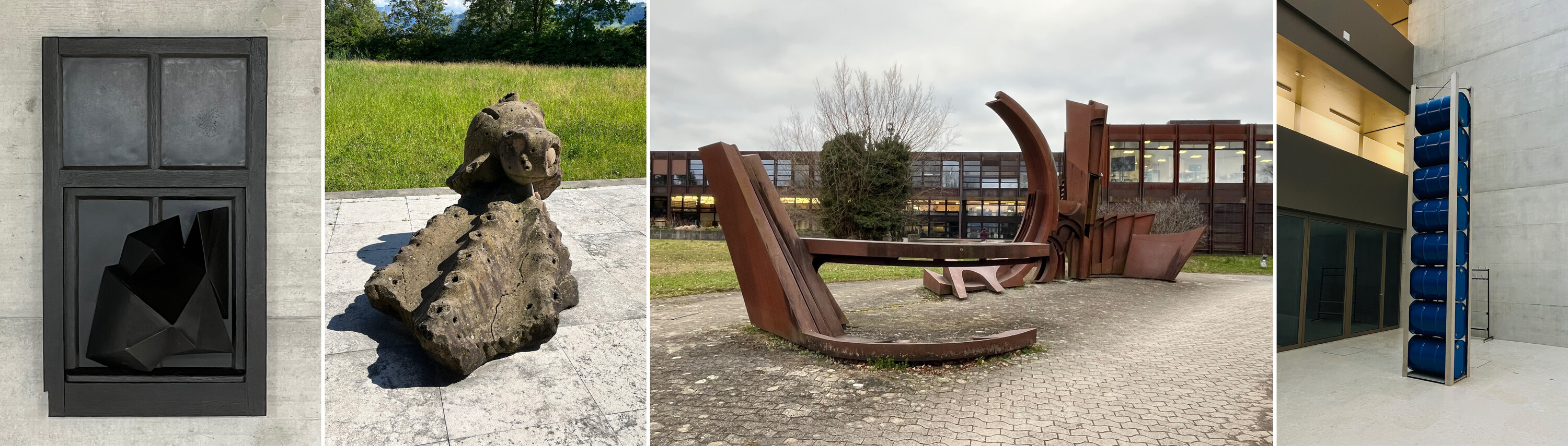Am Campus Rapperswil-Jona der OST können die aufmerksamen Besucherinnen und Besucher einige Kunstwerke entdecken, die in die Architektur fest integriert sind. Zuerst fällt wohl die monumentale, an einen Schiffsrumpf gemahnende Stahlplastik Komposition in Cor-Ten (1972/1973) von Silvio Mattioli (1929­–2011) ins Auge. Die aus acht aufeinandergestapelten blauen Fässern bestehende Skulptursäule (2015) von Roman Signer (*1938) beherrscht das Atrium des Forschungszentrums (Gebäude 8). Am Eingang des Gebäudes überrascht ein geheimnisvoller Bronzeguss (2015) von Loredana Sperini (*1970), ein schwarzes Fenster, aus dem eine kristalline Struktur hervorragt. Ein zweites Fensterobjekt verbirgt sich im Nebentreppenhaus. Zwei Amphibische Seeuferskulpturen (2013–2016) aus Sandstein beschliessen den Parcours. Der Künstler Peter Kamm (*1958) hat sie absichtlich so platziert, dass sie den Witterungseinflüssen ausgesetzt sind.