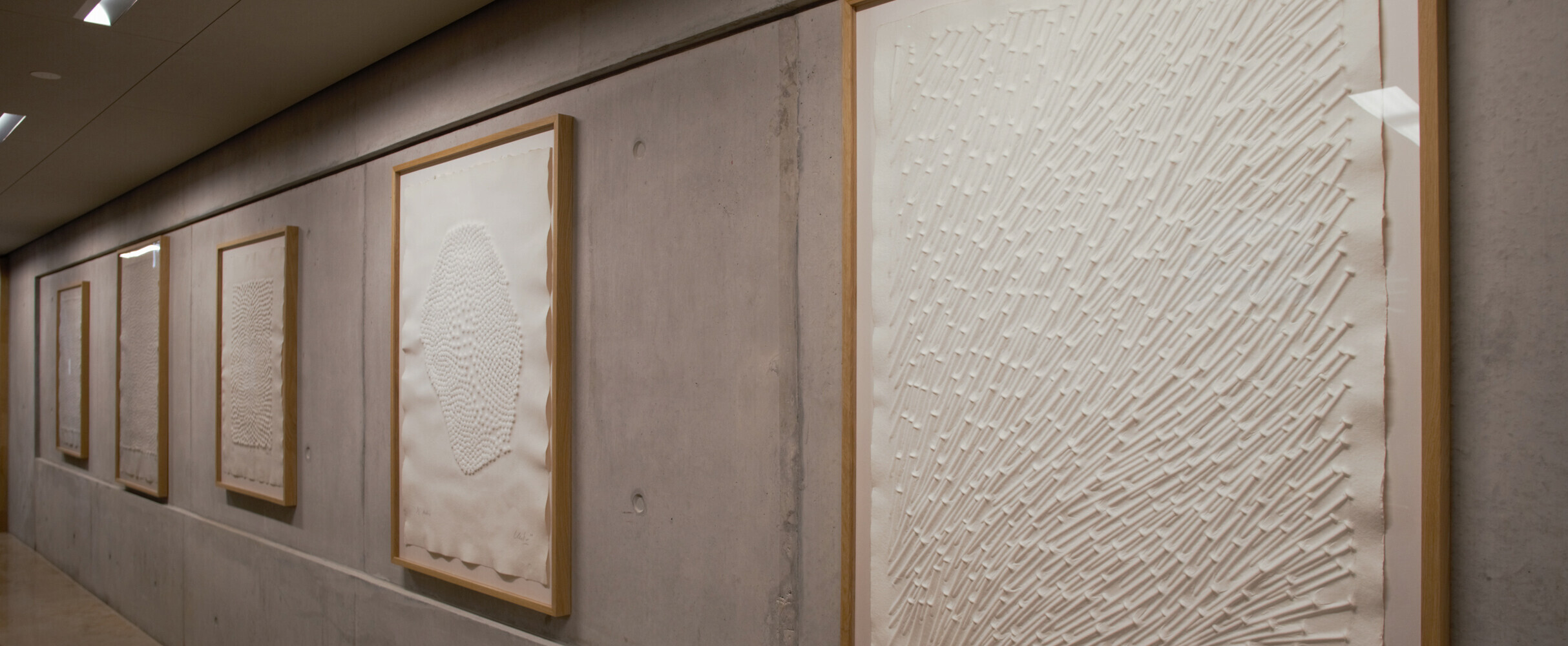 Die öffentlichen Korridorräume der Sockelgeschosse sind geprägt durch Sichtbetonwände und eine feine Rahmenbildung der reliefartigen Nischen, wo das Bild seinen zugewiesenen Platz bekommt oder in anderen Worten: die Kunst sich ihren Platz erobert. Hier sind wechselnd Druckgrafiken und bibliophile Bücher ausgestellt, die in der Erker-Presse in St.Gallen entstanden sind.