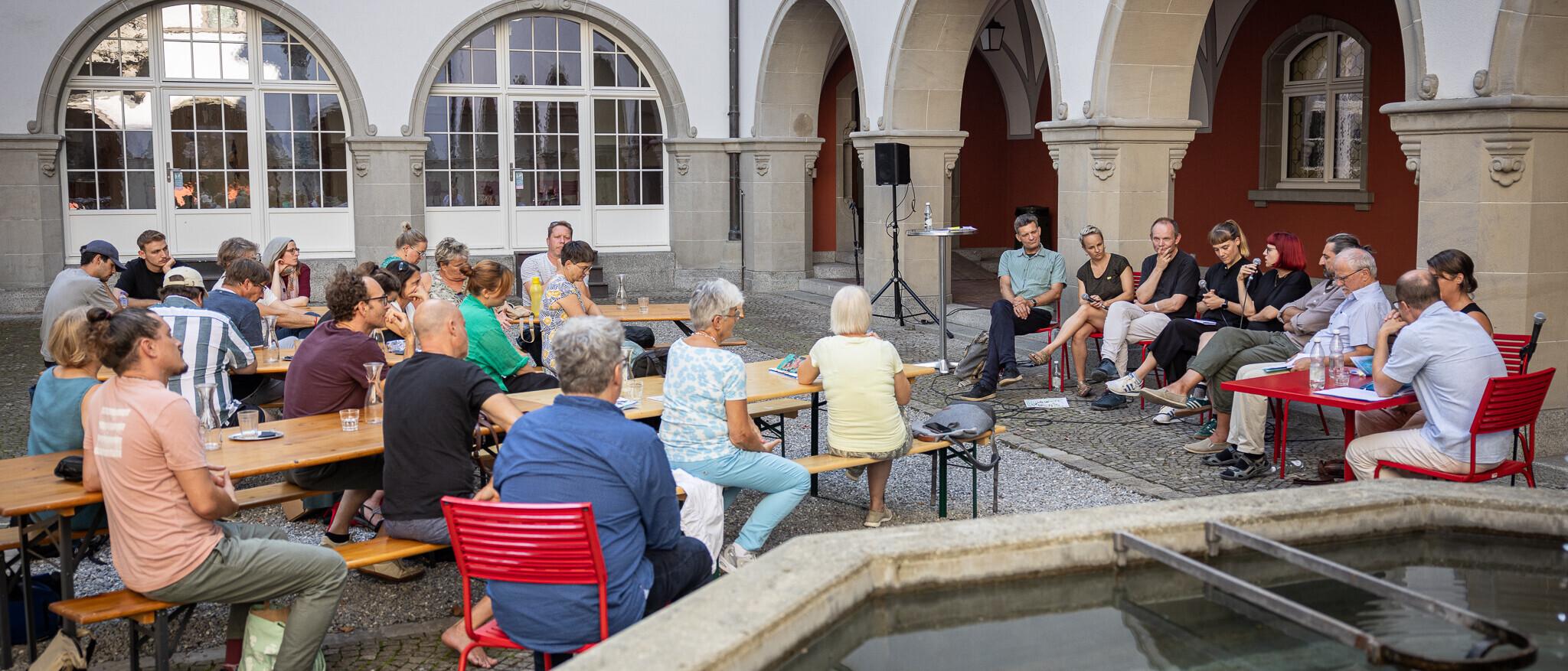 Rund 20 Personen finden sich an diesem lauen Nachmittag im Innenhof des Kulturmuseums zum Fachgespräch ein. Es herrscht eine familiäre Atmosphäre. Publikum und Fachleute kennen einander. Vor den Arkaden sind die Teilnehmenden des Podiums platziert. Mit dabei ist Heinz Wettstein, der Protagonist des Anlasses. Er hat die Entwicklung der Offenen Kinder- und Jugendarbeit und die Ausbildung der Soziokulturellen Animation in der Deutschschweiz stark mitgeprägt. Seine berufliche Geschichte bildet die Grundlage des Buches. Auf dem Podium sind Fachpersonen aus verschiedenen Bereichen vertreten, die zentrale Fragen zur Soziokulturellen Animation aus unterschiedlichen Perspektiven diskutieren.