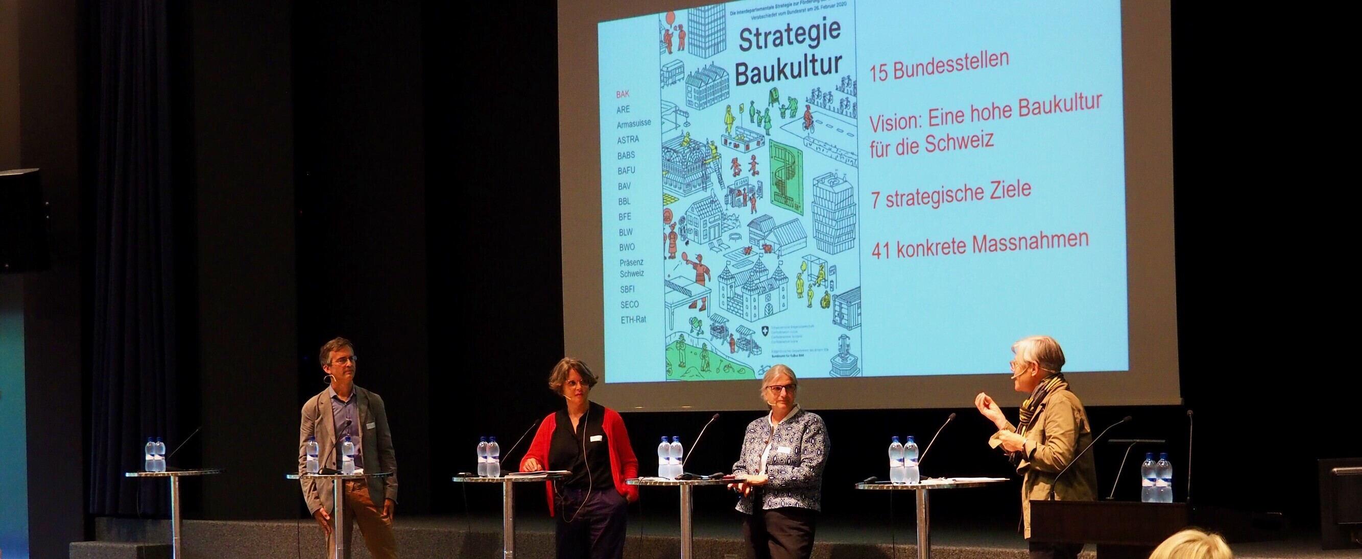 Am 15. September haben sich Vertreterinnen und Vertreter der Bundesämter für Kultur, Raumentwicklung und Umwelt, von kantonalen und kommunalen Behörden, der Berufsverbände aller beteiligten Disziplinen, von Investoren und Bauherren, der Zivilgesellschaft, aber auch Studierende des neuen Departements zuerst mit den Visionen zur Baukultur, dann mit dem aktuellen Zustand der gebauten Umwelt, und später mit den Chancen und Risiken dieses Gemeinschaftswerks auseinandergesetzt.