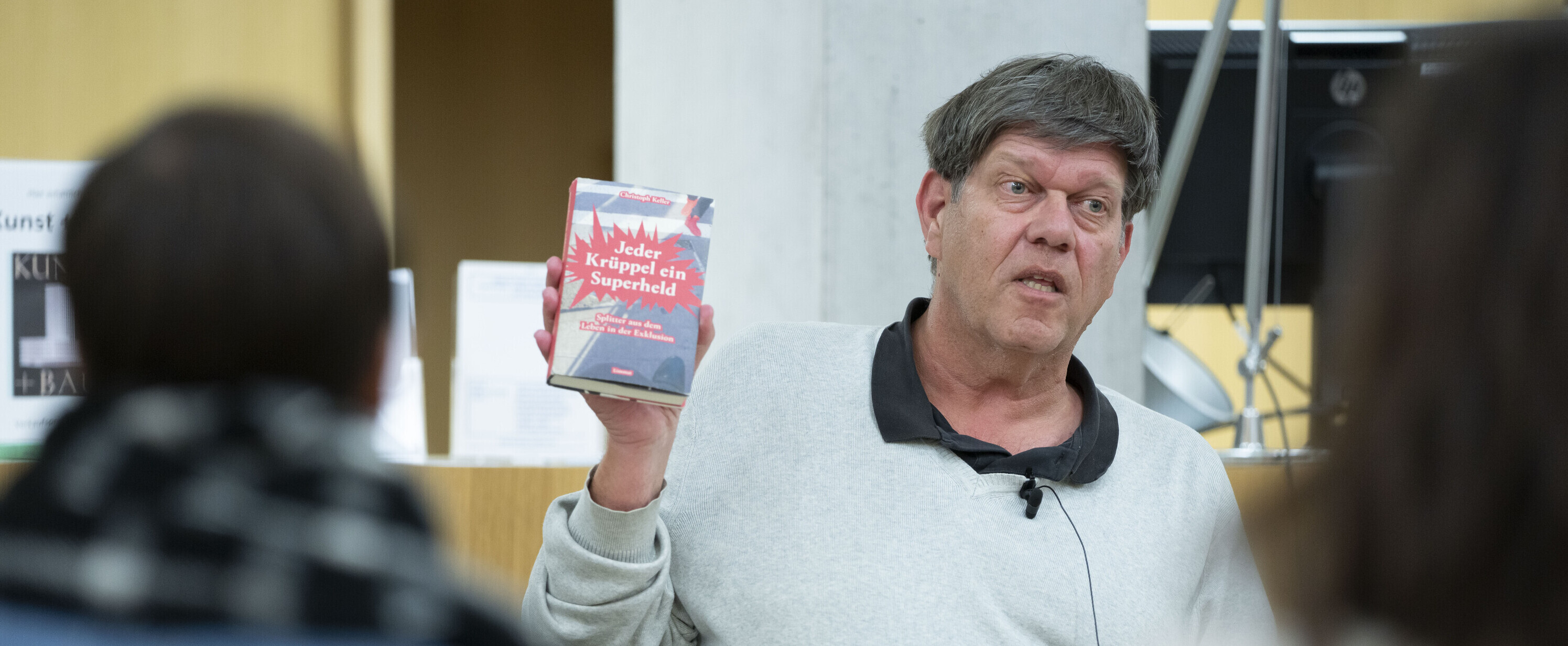 Raúl Krauthausen ist Inklusions-Aktivist und Gründer der Aktionsgruppe Sozialhelden. Seit 15 Jahren arbeitet er als Medienmacher und Design Thinker in der Internet- und Medienwelt. Das Netz ist sein zweites Zuhause. Dort twittert, bloggt und postet er über die Dinge, die ihn bewegen. Raúl Krauthausen ist im Rollstuhl unterwegs. Seine Behinderung ist für ihn aber nur eine von vielen Eigenschaften. In seiner Autobiografie «Dachdecker wollte ich eh nicht werden», aus der er am 7. November anlässlich des Kulturzyklus vorlas, erzählte er aus seinem Leben und spricht über seinen Alltag. Und darüber, wie Menschen mit und ohne Behinderung miteinander leben können. Auf die Lesung folgte ein Interview mit dem Autor.
