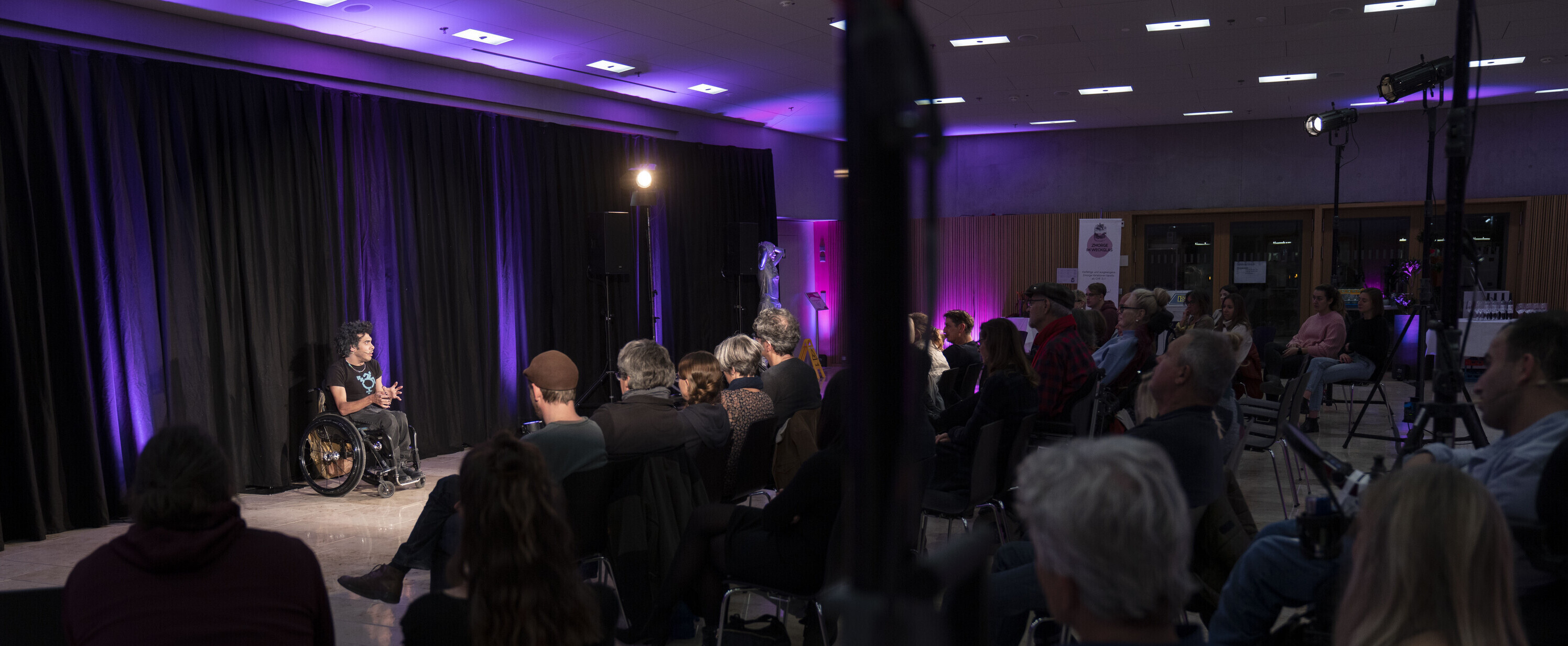 «Es ist normal, verschieden zu sein.» Diese Botschaft macht Graf Fidi, der am letzten Tag des Kulturzyklus am 9. November auftrat, zu seinem Beruf. Geboren mit einer Gehbehinderung und sechs Fingern meistert der Rapper und Inklusionsbotschafter seinen Job als Sozialarbeiter und seine Leidenschaft – die Musik. Mit jedem Auftritt beweist Graf Fidi, dass man trotz körperlicher Einschränkungen alles machen kann. Auch wenn er sich als Sprachrohr für Menschen mit Behinderung sieht, ist sein musikalisches Repertoire vielseitig und nicht nur auf seine Behinderung fokussiert. In erster Linie verbreitet seine Musik gute Laune, und hin und wieder zieht er sich gerne auch einmal selbst verbal durch den Kakao. Am Kulturzyklus hat Graf Fidi gesungen und im Künstlergespräch Fragen beantwortet.