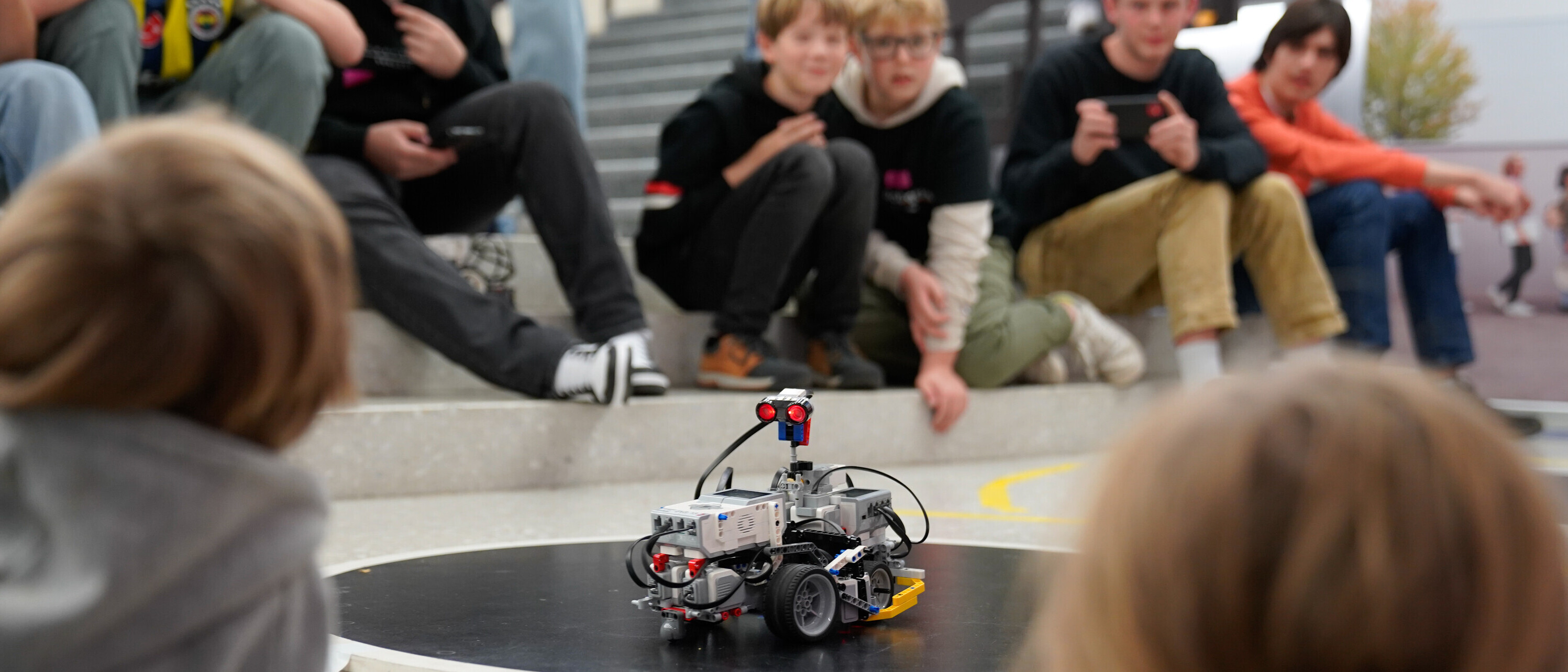 Die Uhr läuft, die Linie bis ans Ziel ist noch lang: Der Roboter vom Team «Roboter Brigade» folgt der schwarzen Linie auf dem Tisch, biegt aber an der falschen Stelle ab – und fährt in die Sackgasse. Zwei Mädchen aus dem Team diskutieren, programmieren ihren Roboter um, setzten ihn erneut auf die Linie. Noch sind es erst Probeläufe, doch bis zum Wettkampf sind es nur noch wenige Stunden. Wochenlang haben die Schülerinnen und Schüler an ihren selbstgebauten Robotern gearbeitet und sie für die RobOlympics, die Olympischen Spiele für Roboter, vorbereitet. Den letzten Schliff können sie erst vor Ort, auf dem Originalparcours machen. Es liegt Wettkampf-Atmosphäre in der Luft.