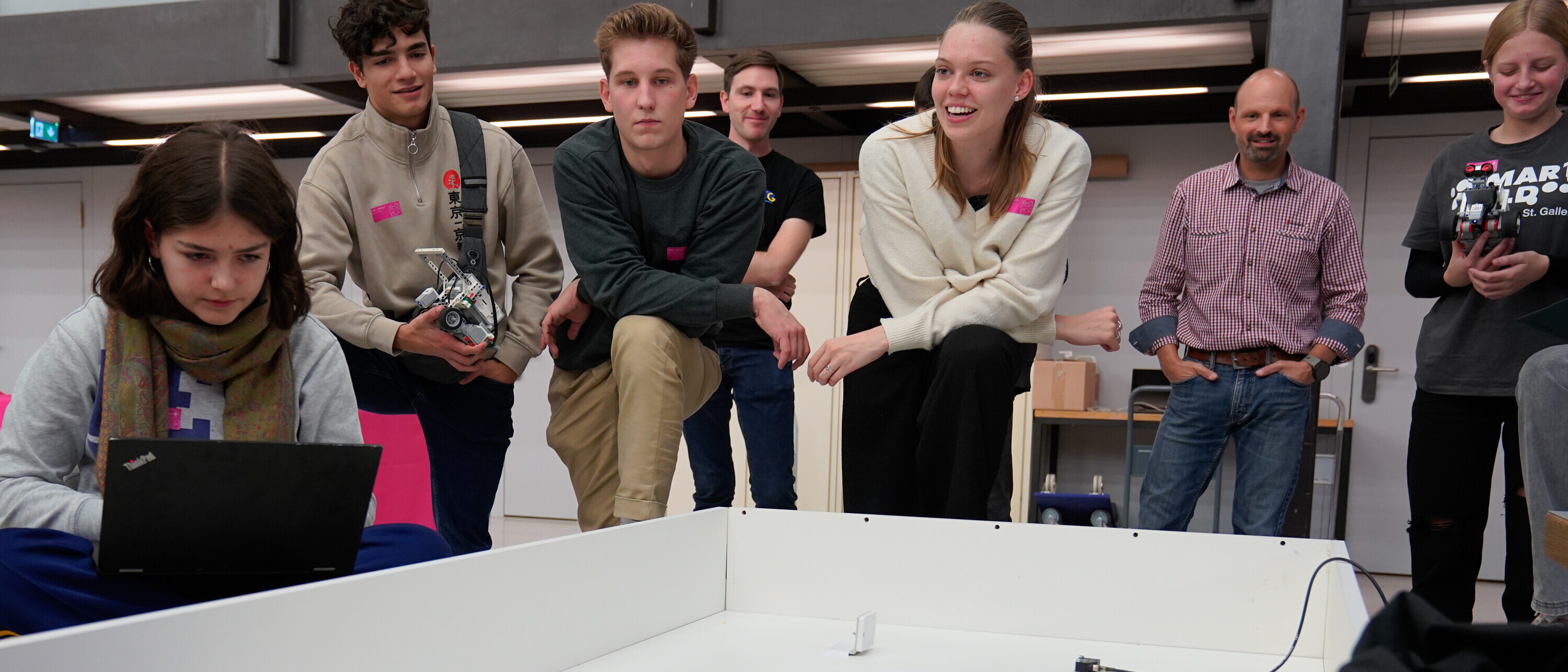 Gegen 100 Schülerinnen und Schüler vorwiegend aus der Oberstufe, von Kantons- und Berufsschulen sind am Samstag an die OST – Ostschweizer Fachhochschule nach Rapperswil gereist, um ihre Roboter im Wettkampf gegeneinander antreten zu lassen. Zur Auswahl standen ihnen verschiedene Disziplinen wie Mini Sumo Ringen, bei dem zwei Roboter versuchen sich gegenseitig aus der Arena zu stossen, Torschiessen, Linienfolger oder «move it over», wo Tischtennisbälle ins Spielfeld des Gegners befördert werden müssen. Auf die Überraschungsaufgabe konnte sich kein Team vorbereiten, sie wird jeweils erst am Spieltag bekannt gegeben. Dieses Jahr trug sie den Namen «Klapp den Code» und bestand darin, drei Farbfelder am Boden einzulesen und danach drei Klappen in der entsprechenden Reihenfolge der Farben umzukippen. «Eine spannende, aber anspruchsvolle Aufgabe», sagte der ICT-Scouts-Coach Fatmir Racipi. Die Mädchen, die er begleitet hat, haben im vergangenen Jahr eine Disziplin gewonnen und sich für dieses Jahr die Überraschungsaufgabe als besondere Herausforderung vorgenommen. «Es zeichnet die RobOlympics aus, dass die Jugendlichen sich vor Ort in den Disziplinen schnell verbessern und lernen können. Das ist sehr motivierend.» Auch die Challenge, sich mit anderen Messen zu können, gefällt vielen Teilnehmerinnen und Teilnehmern. «Es ist cool zu sehen, mit was für Programmen die anderen arbeiten und wie schnell ihre Roboter zum Teil sind. Und mir gefällt die Professionalität, dass die Zeit zum Beispiel mit Lichtschranken gemessen wird», sagte ein Teilnehmer.