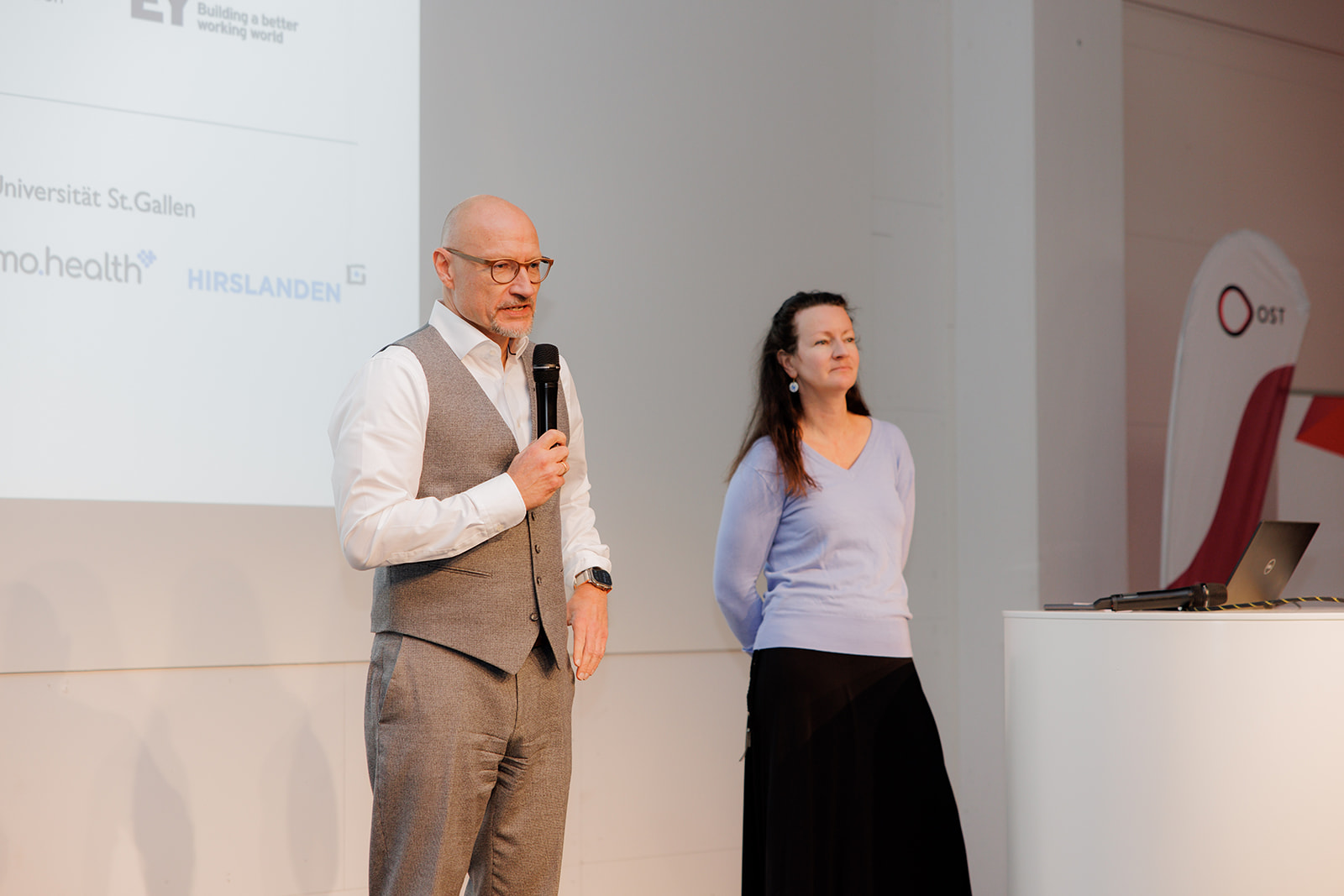 1_Age_Innovation_Prize_2023.jpg: Sabina Misoch, Gesamtprojektleiterin AGE-INT IAF Institut für Altersforschung, und Hans Ebinger, CEO Switzerland Innovation Park Ost, begrüssen die Gäste zur Preisverleihung des diesjährigen Age Innovation Preises.