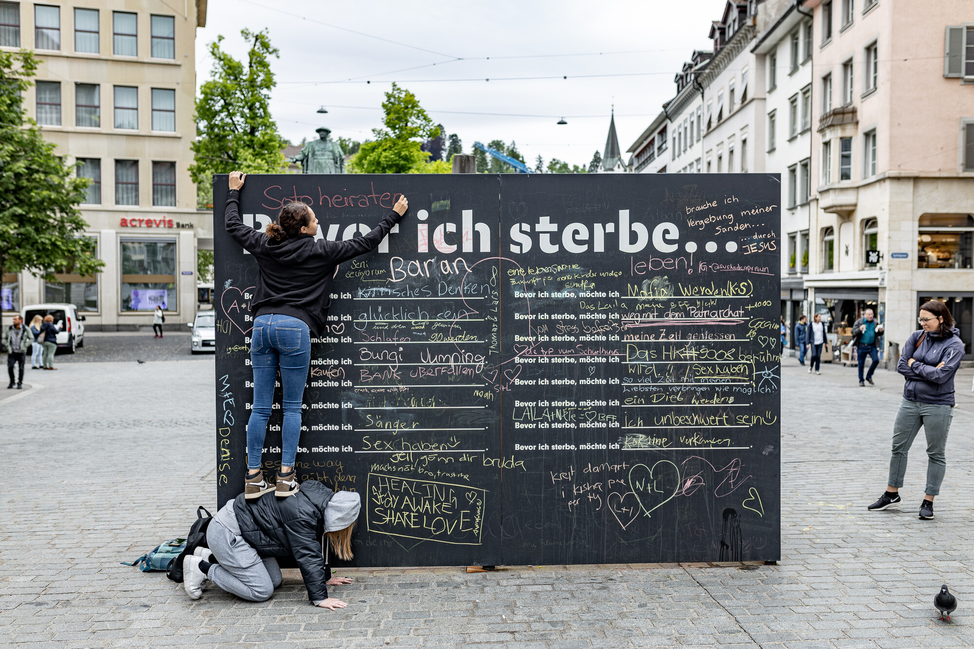 Ursprünglich wurde das Projekt «Before I die» von der amerikanischen Künstlerin Candy Chang nach dem Verlust einer nahestehenden Person ins Leben gerufen. Um ihre Gedanken mit Personen in ihrer Umgebung zu teilen, installierte sie an einem verlassenen Haus in ihrem Wohnquartier in New Orleans eine grosse Wand mit der Aufschrift «Before I die, I want to…» – «Bevor ich sterbe, möchte ich…». Innert kürzester Zeit wurde die Wand von unterschiedlichsten Personen mit ihren Gedanken, Hoffnungen und Träumen befüllt. Inzwischen wurden weltweit mehr als 5000 Wände mit dem Satzfragment «Before I die» in 78 Ländern aufgestellt und in mehr als 20 verschiedenen Sprachen beschriftet.