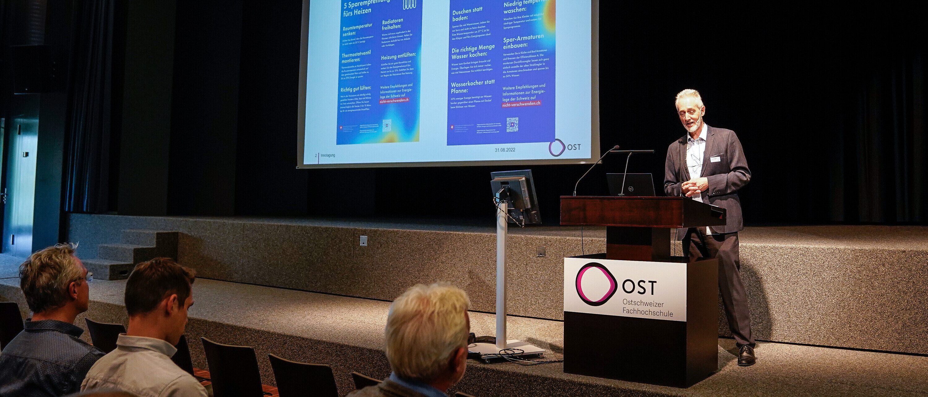 Dass der kommende Winter auch die Bevölkerung und Vertreterinnen von Politik und Unternehmen umtreibt, zeigte sich auch im Publikum in der Aula der OST: Mehr als 250 Besucherinnen und Besucher strömten in die Aula, um den Referaten von vier Energie-Experten zu lauschen und anschliessend weiter zu diskutieren.