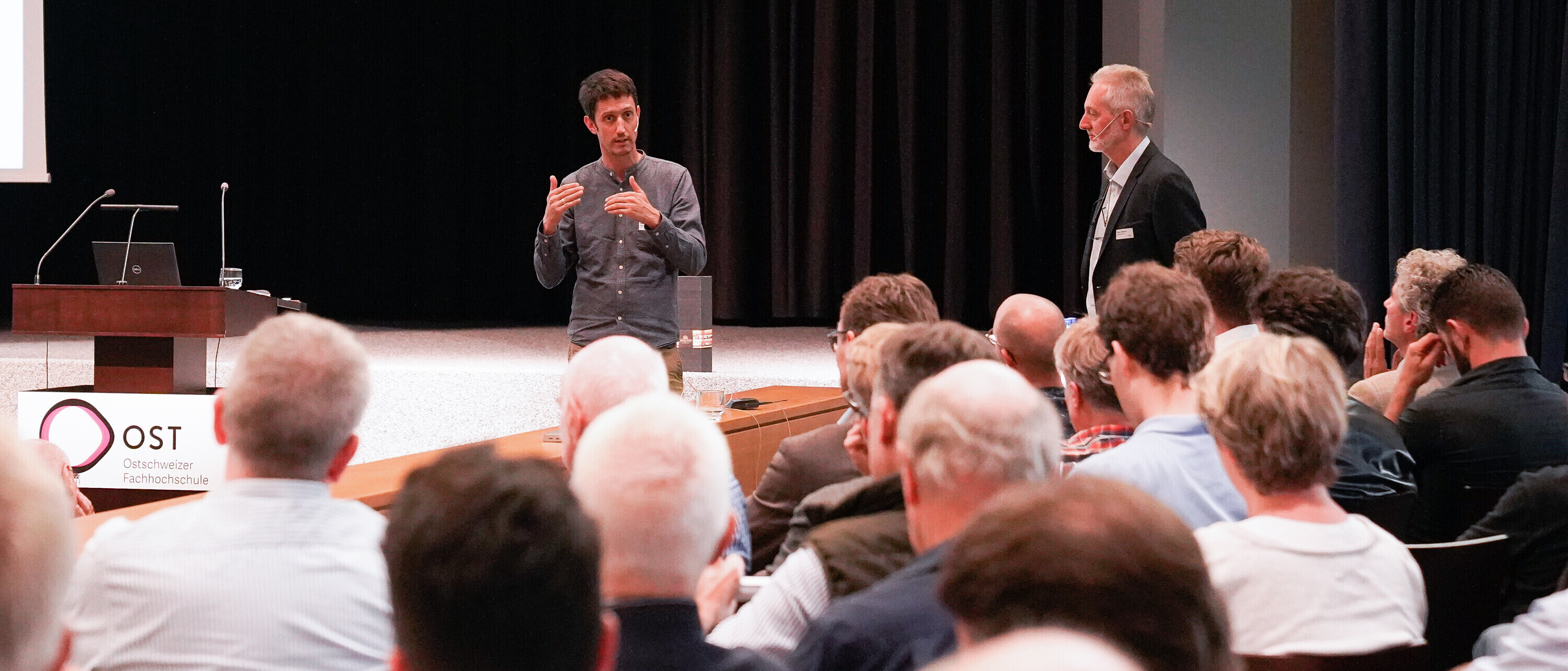 Den Blick auf aktuell in der Entwicklung befindliche Lösungen, übernahm Andreas Häberle, Leiter des Instituts für Solartechnik an der OST. Er zeigte in seinem Vortrag gleichermassen heute bereits verfügbare sowie sich in Entwicklung befindliche Technologien, die die Speicherung von erneuerbaren Energien in den benötigten Massstäben möglich machen. Dabei macht er auf eine Rückfrage aus dem Publikum, warum die Schweiz nicht «die Batterie Europas werde» aber auch physikalische Realitäten deutlich: «Die Schweiz ist dafür nicht gross genug.» Man sei aber derzeit auf dem richtigen Pfad, die künftige Energieversorgung aufzubauen. Beispielsweise werde an der OST derzeit Aluminium als Energiespeicher für sehr grosse Energiemengen aus erneuerbaren Quellen erforscht – ein Projekt, dass auch die EU direkt fördert.