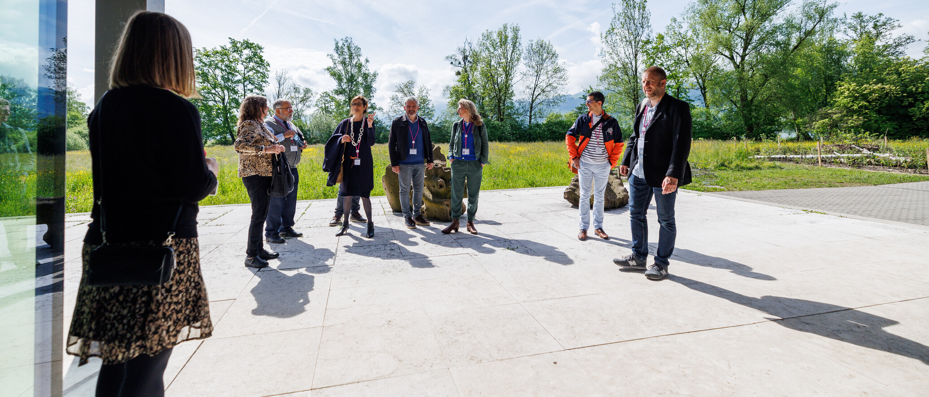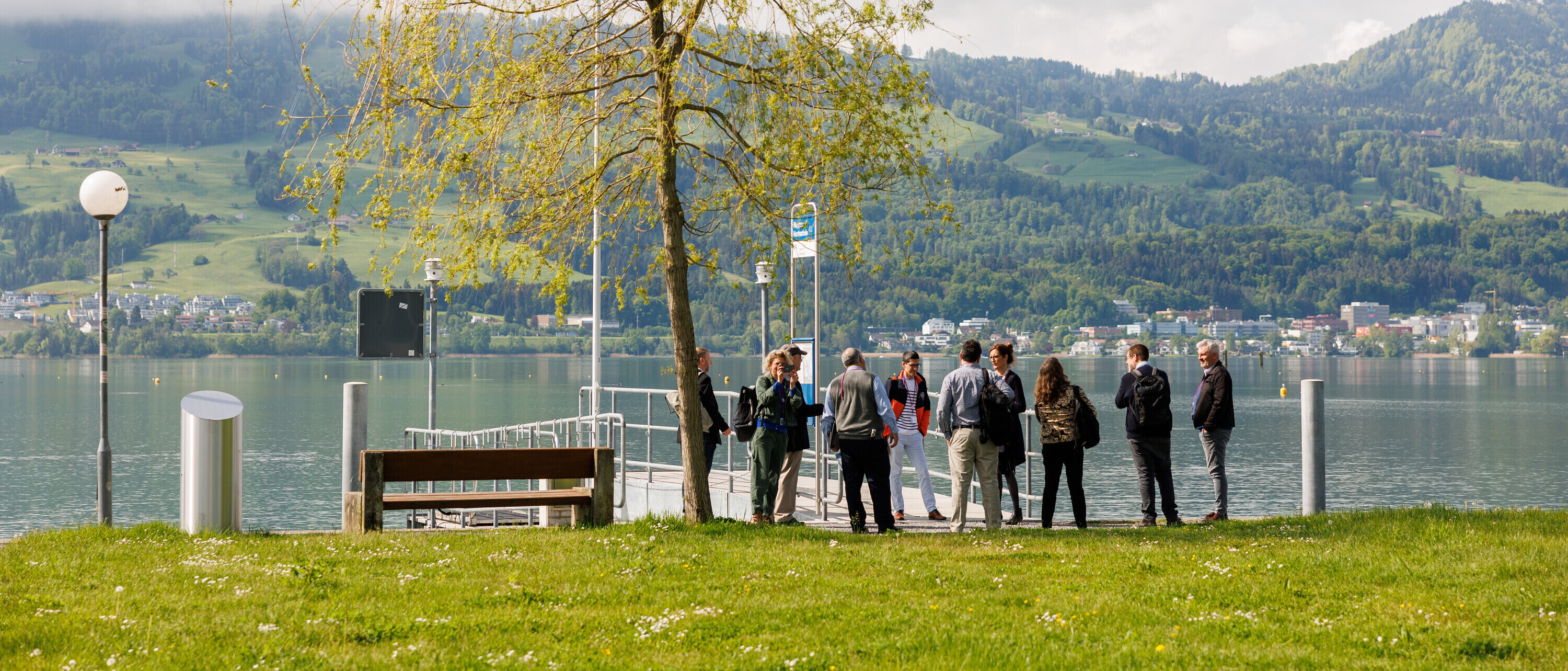 Die aus sechs Ländern angereisten Hochschulvertretenden geniessen die Lage direkt am Zürichsee am Campus in Rapperswil-Jona.