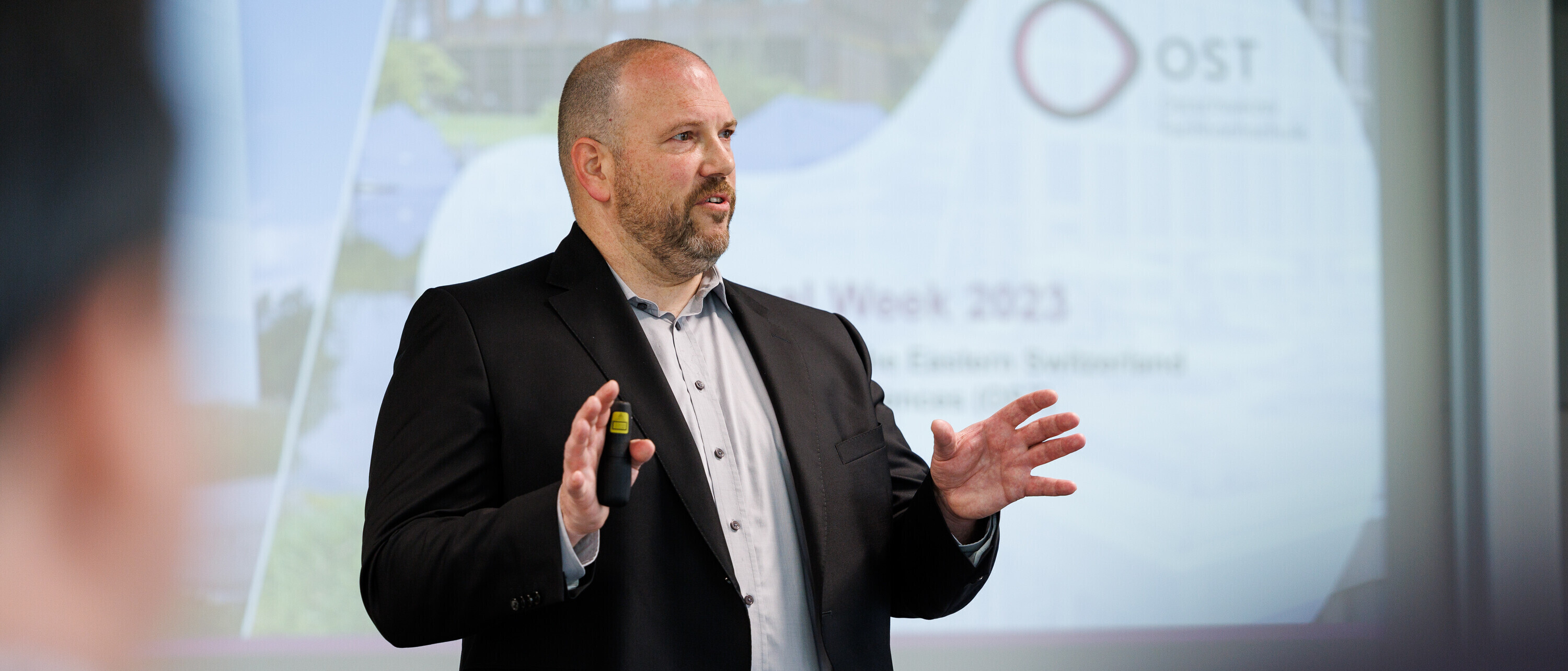 Rektor Daniel Seelhofer begrüsst die Gäste und stellt die OST in Zahlen sowie einige aktuelle Forschungsprojekte vor.