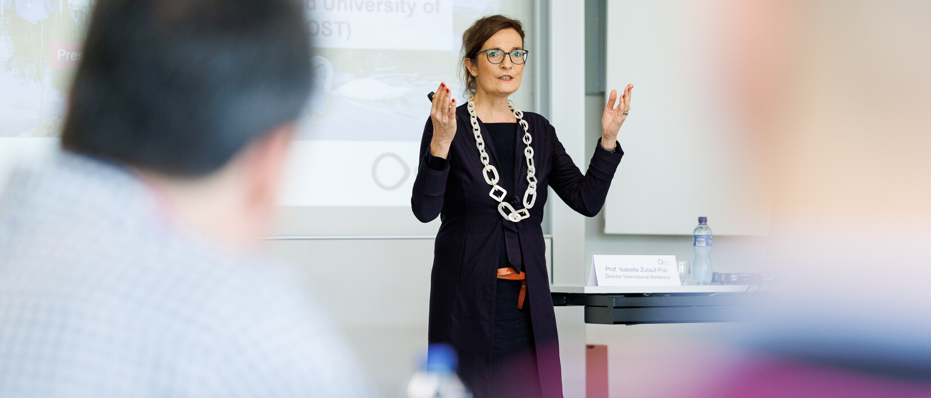Isabelle Zulauf-Poli, Leiterin International Relations OST, begrüsst die Gäste.