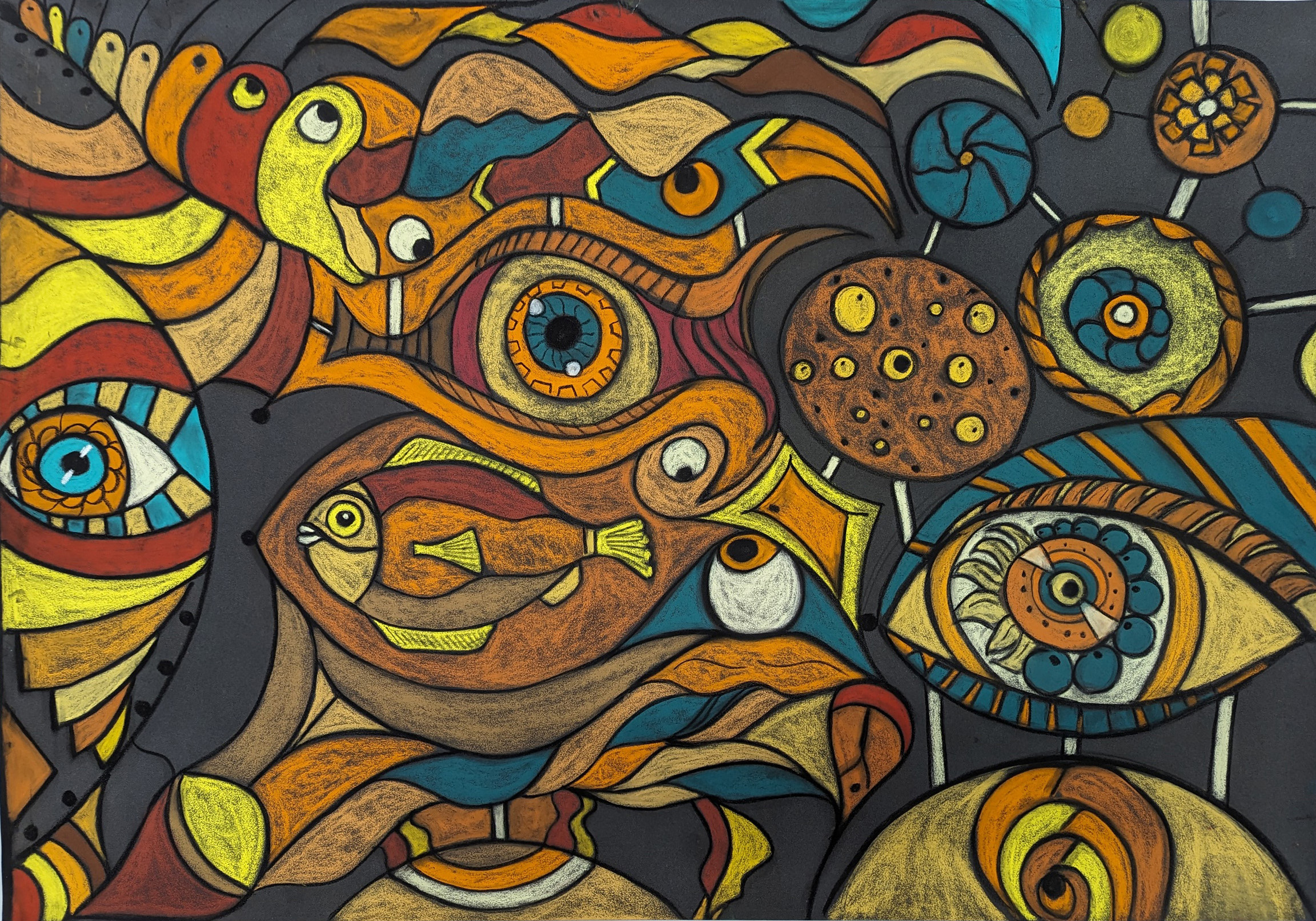 Ingrid Geiger aus Weingarten (D) hingegen spielt mit leuchtenden Farben, die in ihren Werken wie das Licht in Kirchenfenstern erstrahlen. Ohne festes Konzept beginnt sie mit einer Farbe, lässt sich von ihr leiten und erschafft aus dem Moment heraus komplexe, traumähnliche Bildwelten. Ihre Hände folgen dem intuitiven Schaffensprozess, sodass jedes ihrer Werke eine ganz eigene, spontane Dynamik entwickelt. Gerade diese Unvorhersehbarkeit macht ihre Kunst zu einer Einladung, sich auf eine emotionale Reise zu begeben und sich von der Farbintensität mitreissen zu lassen.