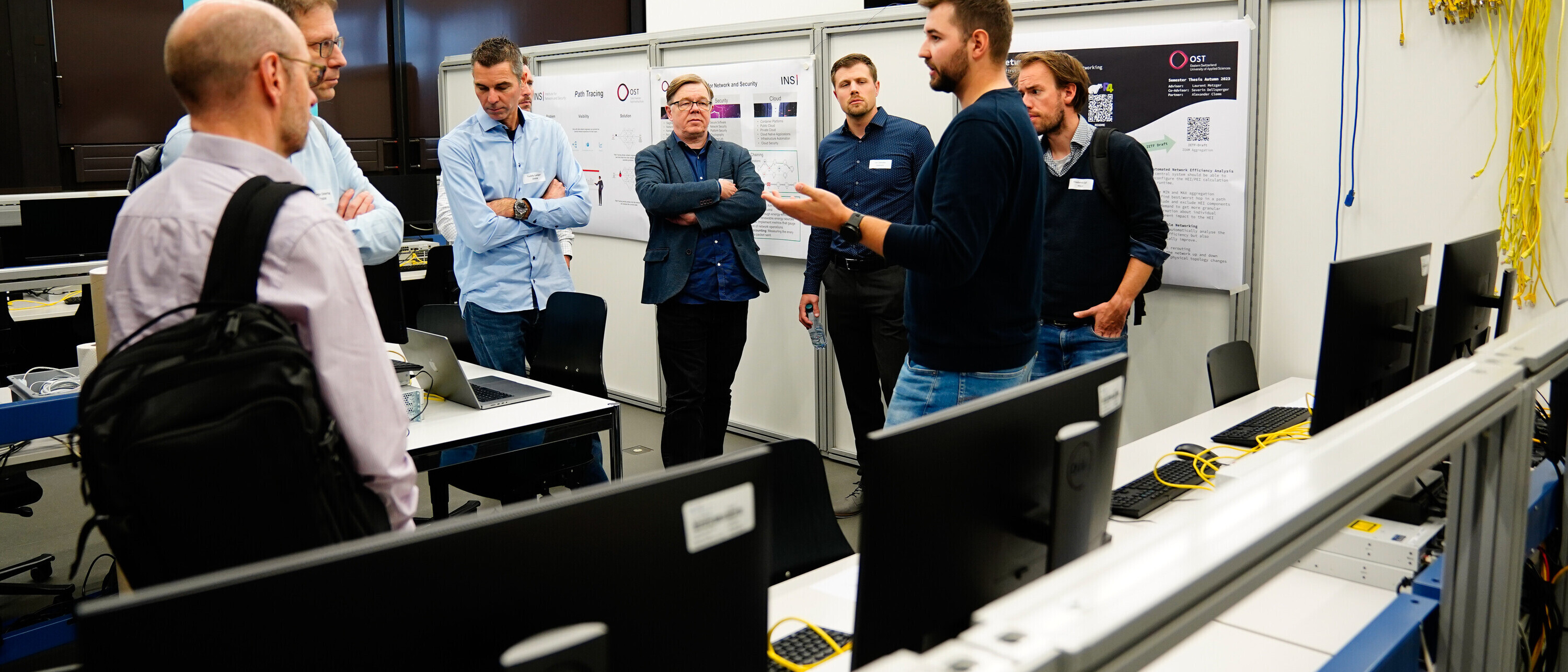 Nach der Begrüssung durch Reto Bonderer, Fachabteilungsleiter Elektrotechnik, und Laurent Metzger, Departementsleiter Informatik an der OST sowie David Gisler und Michael Kiy von Siemens Schweiz standen neben dem Austausch über Technologie-, Wirtschafts- und Didaktiktrends die Führungen durch die Lehr- und Forschungslabors der OST im Zentrum des Dozierendentreffs. Bei vier Führungen konnten die Dozierenden unter anderem das Antennen- und Mikroelektroniklabor sowie Informatiklabors wie das Smart Interaction Lab besuchen.