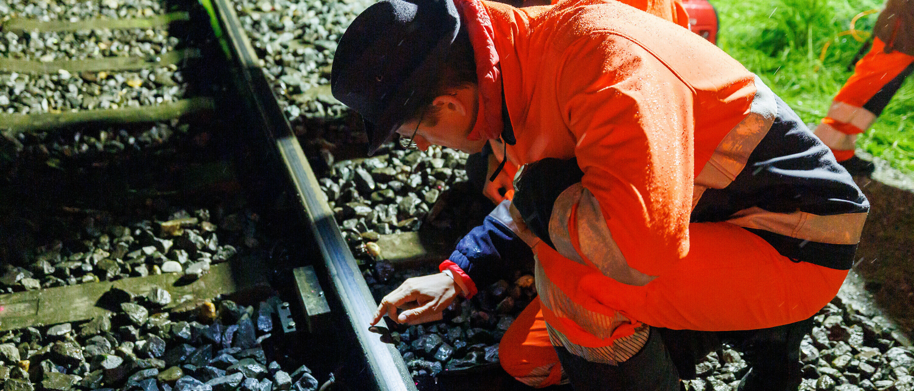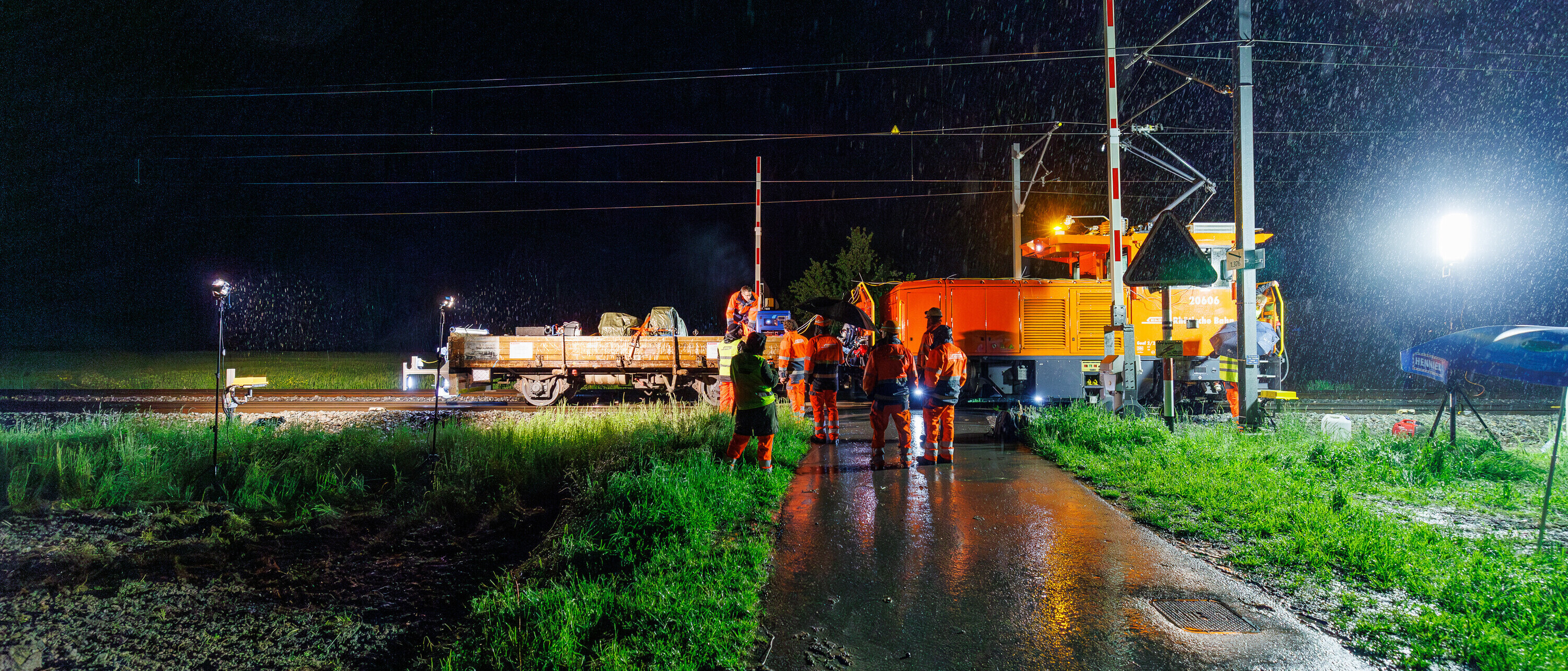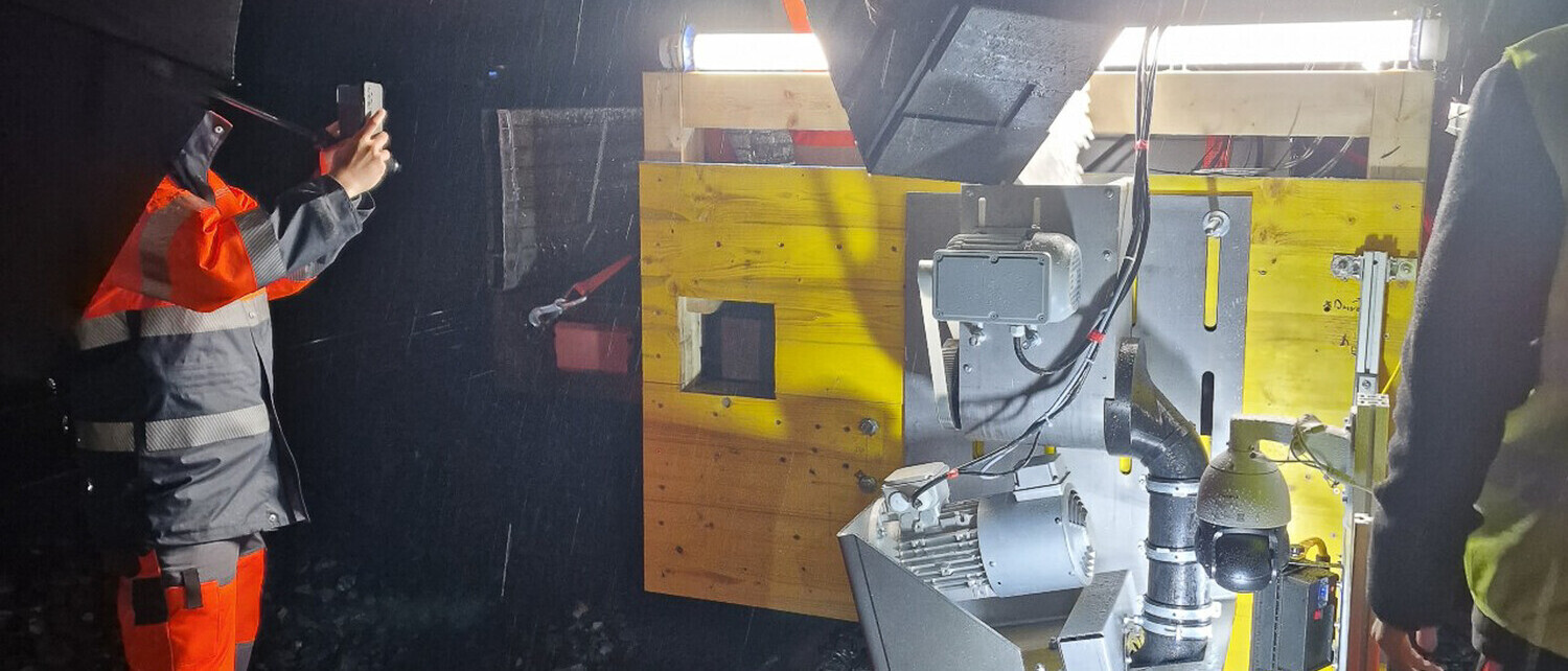 In einer verregneten Nacht im Mai wird der Eisschleuder-Prototyp auf dem Schienennetz der RhB getestet.