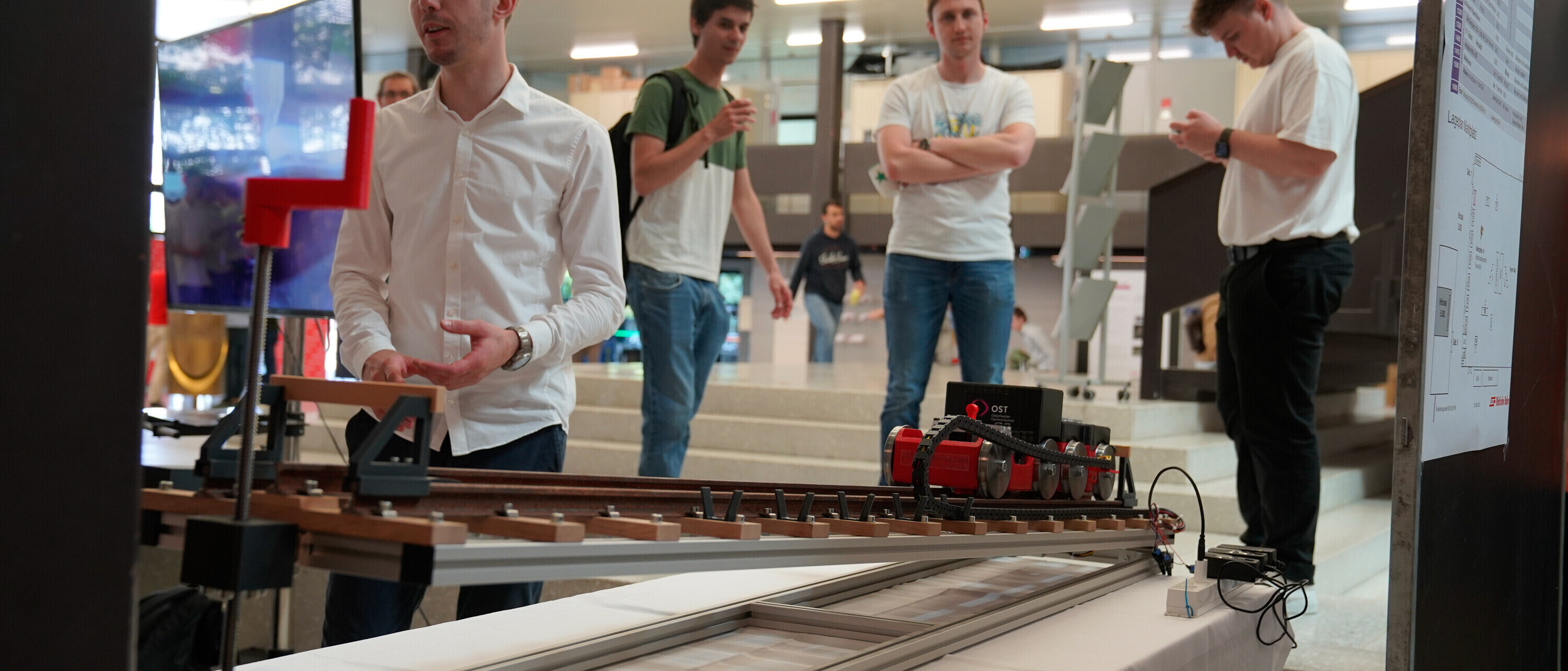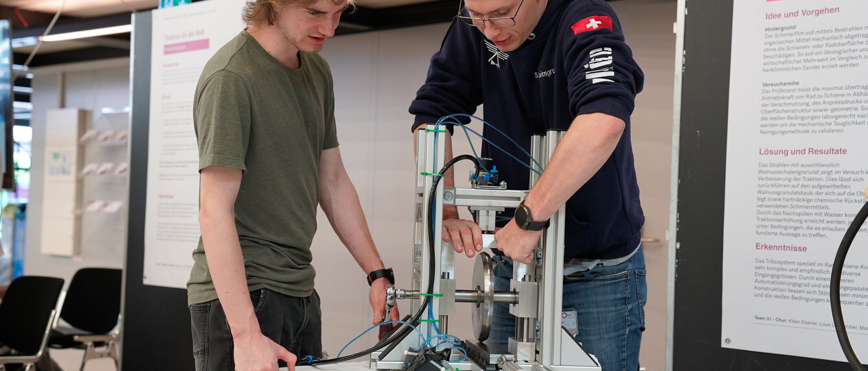 Im Winter verlangt das Einhalten der Fahrpläne Höchstleistungen von der Rhätischen Bahn (RhB). Tausende schmutzige, nasse Fahrzeuge im Autoverlad durch den Vereinatunnel machen die Schienen glitschig. Die Züge können häufig nicht so schnell beschleunigen, wie es die Taktfahrpläne erfordern. In einem gemeinsamen Entwicklungsprojekt hat die RhB 11 Studierendenteams der OST damit betraut, eine Lösung für das Problem zu finden. Ende Mai haben die Studierende ihre Prototypen vorgestellt. Die RhB ist begeistert und arbeitet nun auf der Basis der einzigartigen Konzepte an einer eigenen Lösung.