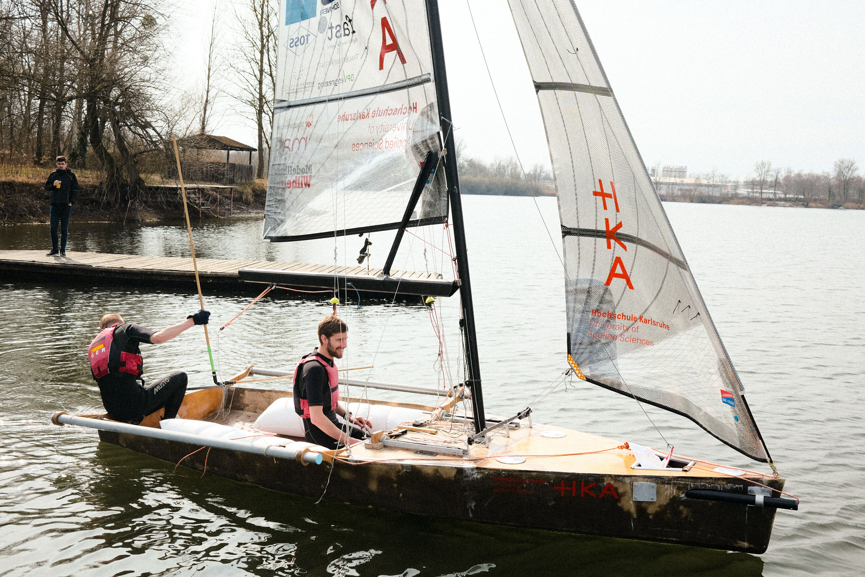 Das Karlsruher ecosail-Team verfügt inzwischen über zwei einsatzbereite Boote, die von Jahr zu Jahr entweder neu gebaut oder optimiert werden. Die beiden erfahrenen Segler Johannes Bruns, Absolvent des HKA-Bachelorstudiengangs Wirtschaftsingenieurwesen, und Daniel Wenger, Absolvent des HKA-Bachelorstudiengangs Maschinenbau, stellten ihren Schweizer Kommilitonen und den anwesenden Sponsoren die technischen Details der Boote vor, bevor sie mit ihnen eine Probefahrt unternahmen.