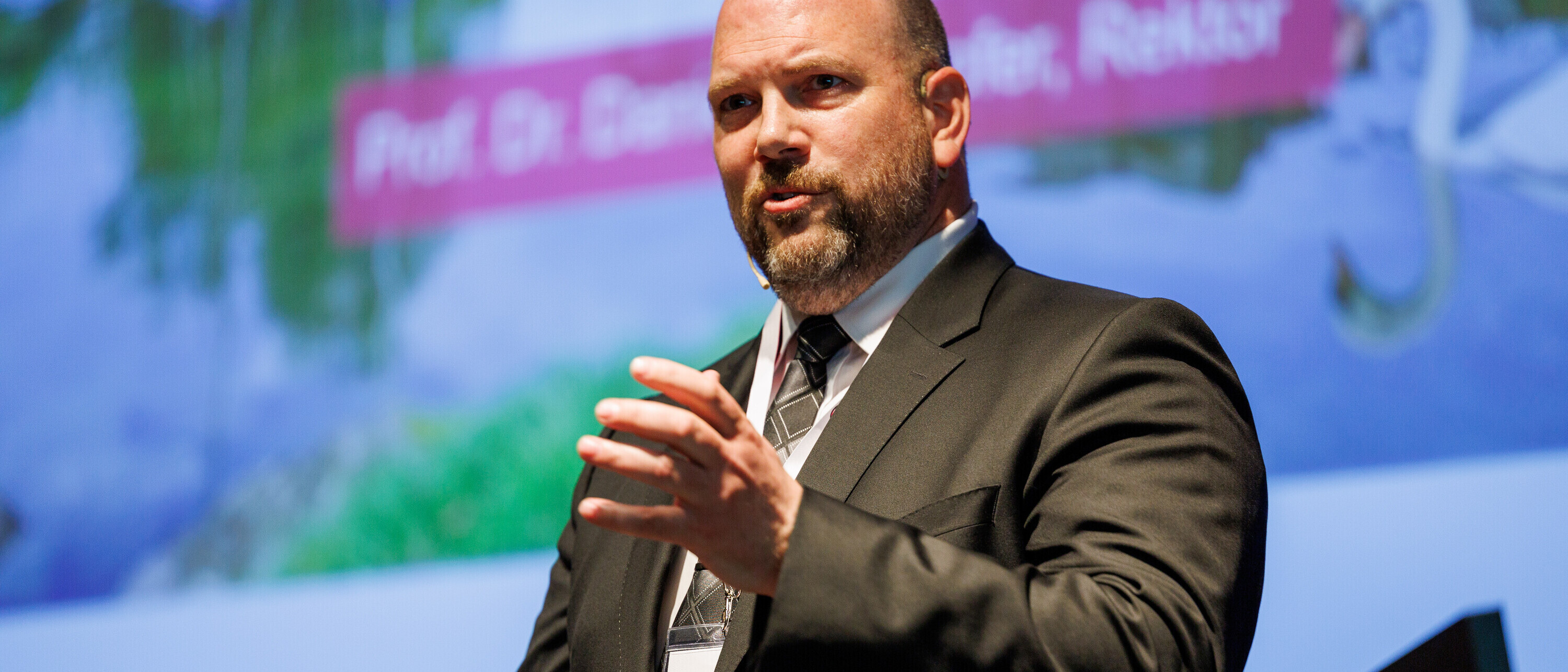 Rektor Daniel Seelhofer begrüsst die rund 150 Gäste des ersten Hochschultages zum Thema Klima und Energie an der OST.