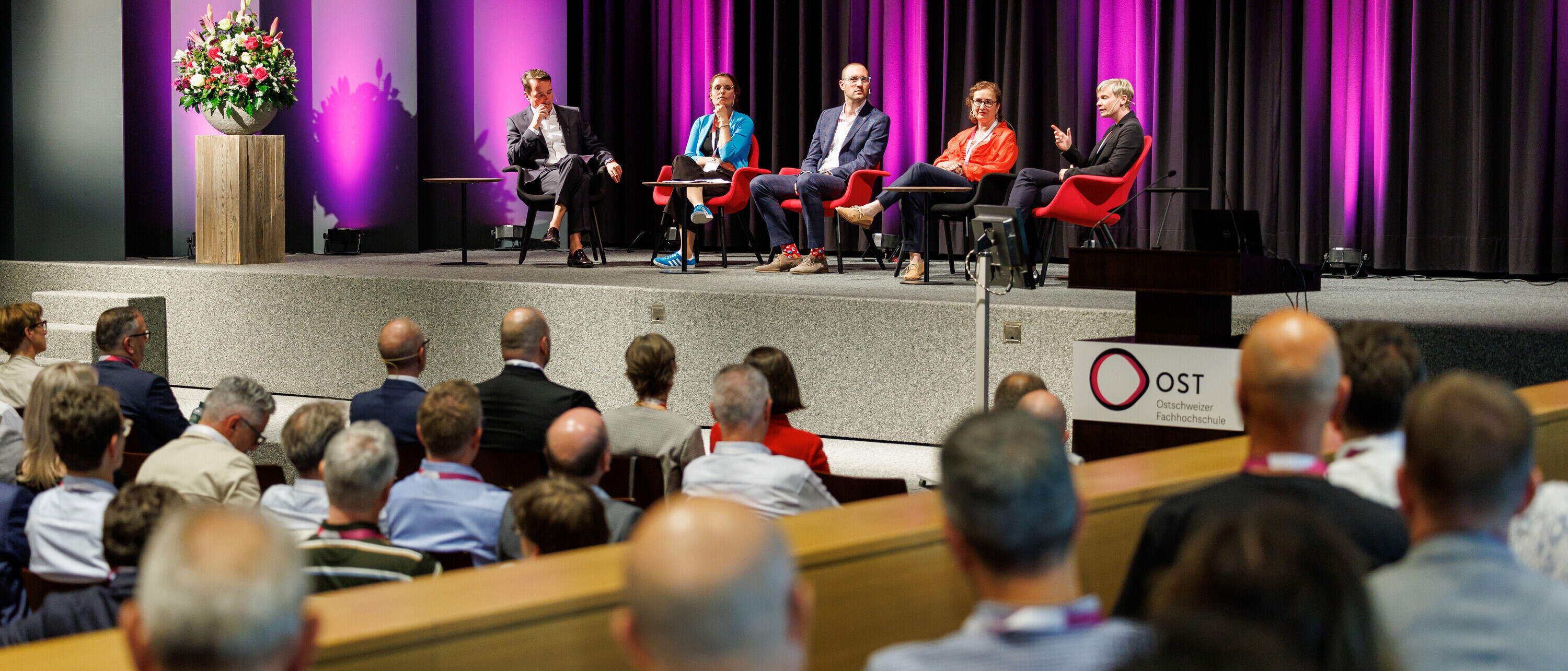 In Podiumsdiskussionen stehen die Expertinnen und Experten der OST Moderator Florian Inhauser Red und Antwort zu technischen und nicht-technischen Klimakrisen-Lösungen.