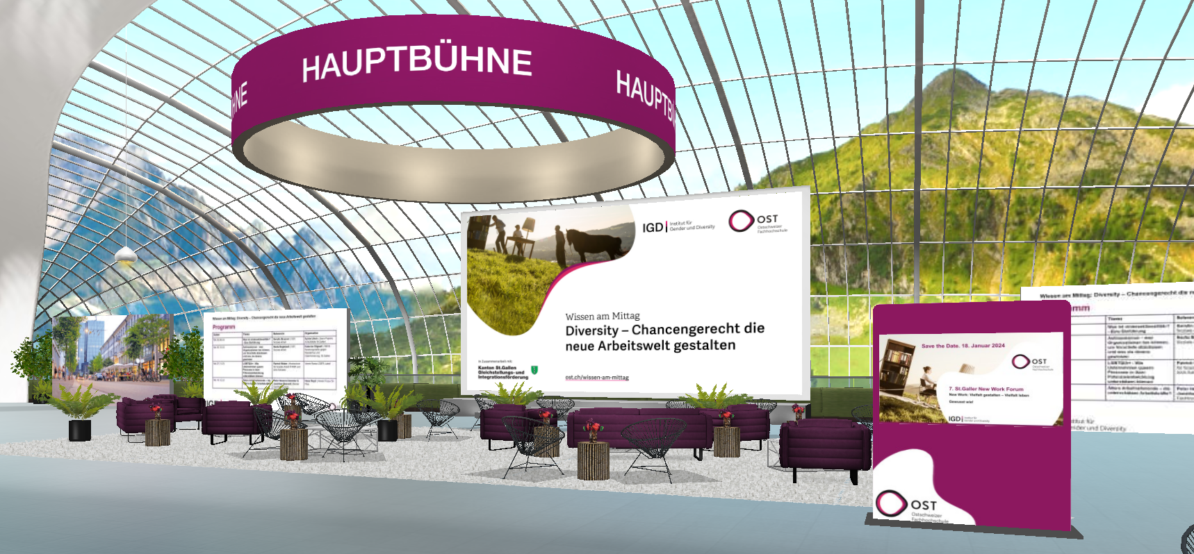 Das Online-Format «Wissen am Mittag» wird vom Institut für Gender & Diversity der OST – Ostschweizer Fachhochschule angeboten und beinhaltet die zwei Veranstaltungsreihen «New Work» und «Diversity». Die Veranstaltungen finden jeweils über Mittag online in einer interaktiven Umgebung (Metaverse) statt. Nebst spannenden Referaten haben die Teilnehmenden die Möglichkeit, sich auszutauschen und zu vernetzen.