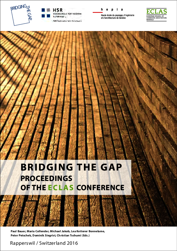 Die Conference Proceedings beinhalten alle Beiträge der ECLAS Conference 2016, die vom 11. – 14. September 2016 an der HSR Hochschule für Technik Rapperswil stattfand. Die Konferenz zum Thema „Bridging the Gap“ bot neben fünf Keynotes rund 120 Beiträge von Teilnehmenden in den Themenbereichen Landscape Design, Landscape Planning, Construction/IT, Plant Design sowie Teaching Landscape.