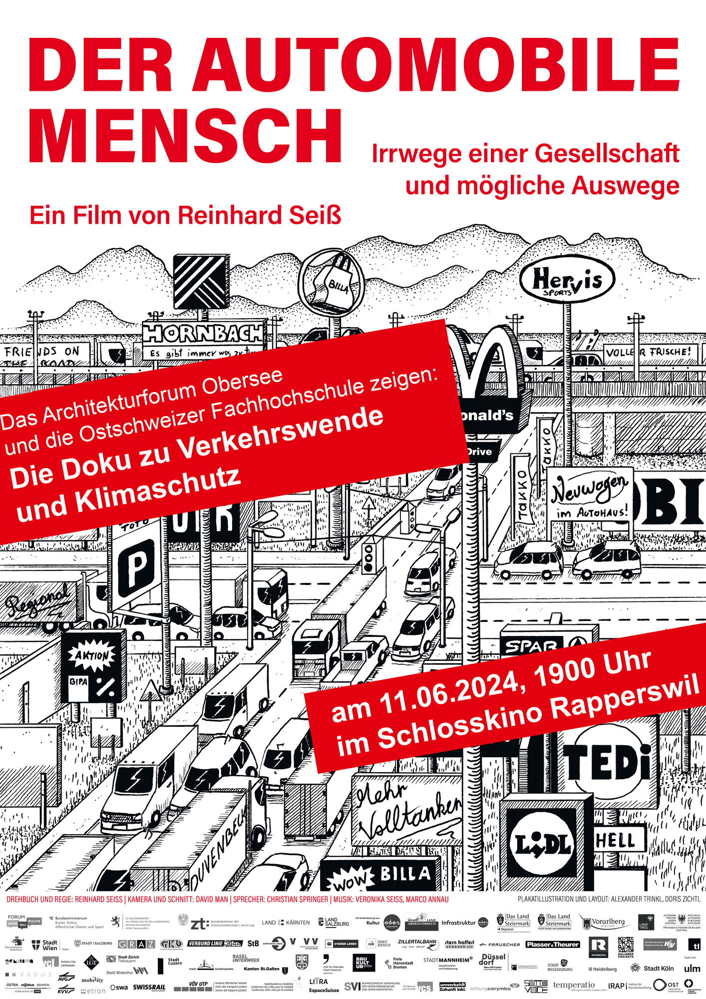 Das IRAP präsentiert zusammen mit dem Architekturforum Obersee den Film «Der automobile Mensch». Der Regisseur und Raumplaner Reinhard Seiß ist bei der Vorstellung anwesend und diskutiert anschliessend mit den Besuchern.