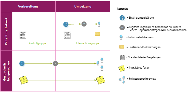 Für die Evaluationsforschung werden während der Umsetzung sowohl qualitative als auch quantitative Daten von Patientinnen und Patienten sowie Angehörigen der Gesundheitsberufe erhoben. Qualitative Daten werden durch das so genannte digitale Storytelling gewonnen, eine Methode, die wir bereits in einer früheren großen Studie erfolgreich eingesetzt haben, sowie durch persönliche Interviews und Feed-back-Fragebögen. Die quantitativen Daten werden aus Fragebogenerhebungen gewonnen.