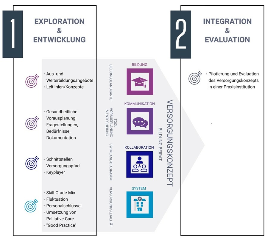 Im geplanten Praxisentwicklungsprojekt werden erwachsene Menschen mit kognitiver oder Mehrfachbeeinträchtigung fokussiert, die in den Kantonen St.Gallen, Appenzell Innerrhoden, Appenzell Ausserrhoden und Thurgau in einem Wohnheim betreut werden. Das Praxisentwicklungsprojekt zielt auf eine nachhaltige Entwicklung eines Palliative Care und End-of-Life Care-Versorgungskonzepts in der Ostschweiz ab. Die Schaffung eines Beirats mit Fachpersonen aus Praxis, Forschung und Lehre sowie mit einer/einem Betroffenen und einer/einem Angehörigen legt einen wichtigen Grundstein dafür. Der Beirat ist beteiligt an der Konzeption, Implementierung und Evaluation des Versorgungskonzepts und soll auch nach Projektabschluss bestehen bleiben.