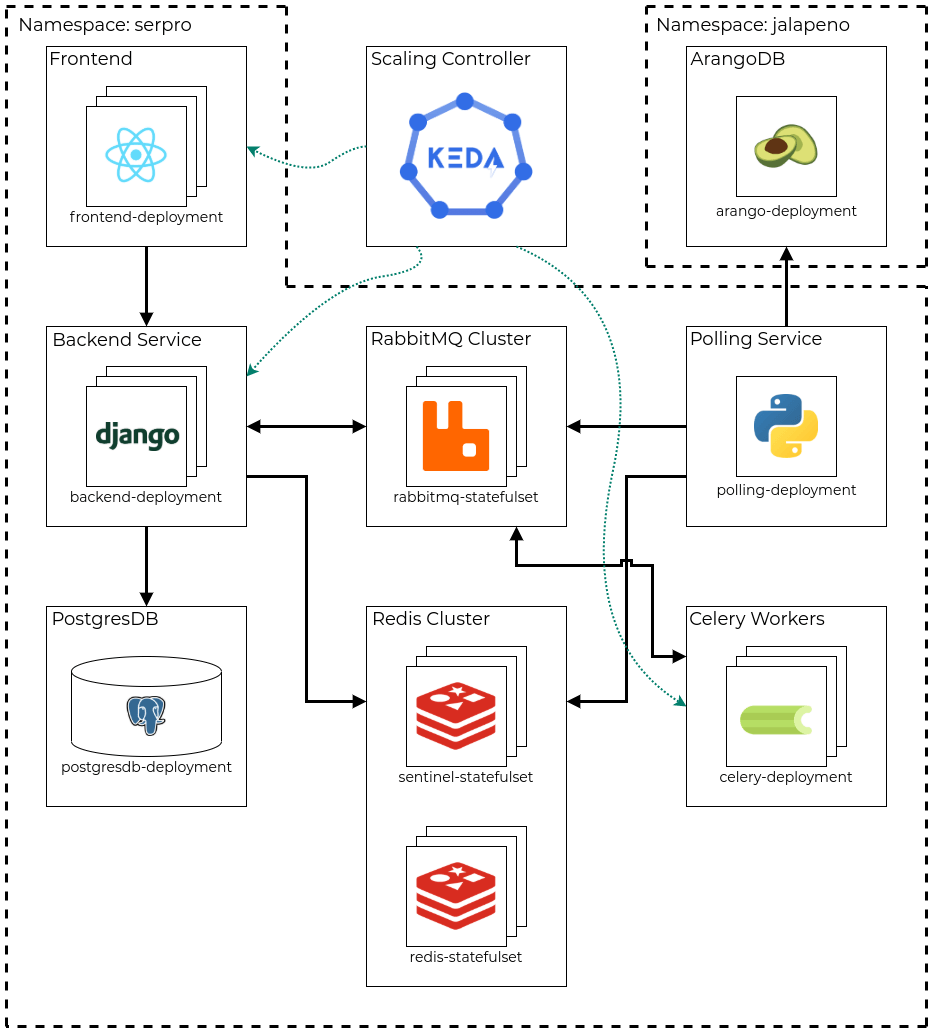 Since Segment Routing is nowadays mainly used in large networks, especially in provider networks, the application must handle extremely large topologies and many users. Due to this fact, the application had to be scalable and highly available. Therefore, a cloud-native approach came to the fore. The complete application was developed cloud-native in order to deploy it natively on a Kubernetes cluster, allowing the application to scale quickly and even allowing the possibility to activate autoscaling functions.