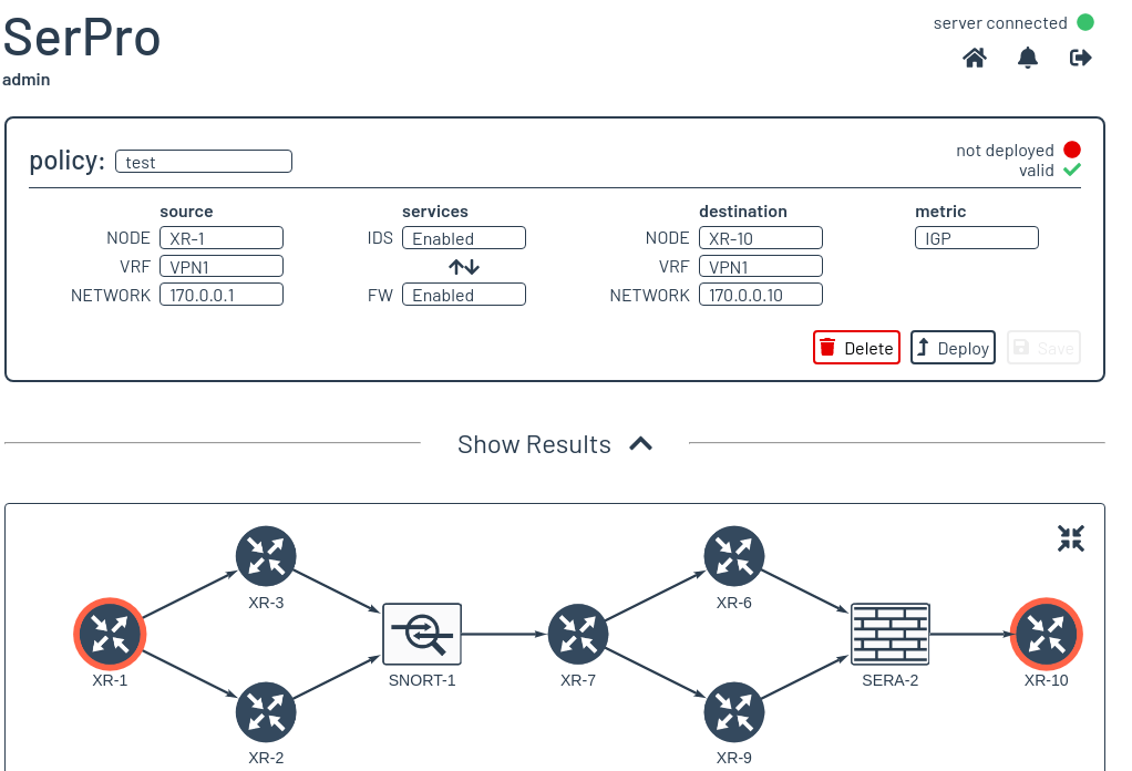 Wir können mit Stolz verkünden, dass wir die Anwendung Segment Routing Service Programming, auch SerPro genannt, entwickelt haben. SerPro erlaubt es dem Kunden, sogenannte Steering Policies über eine dedizierte GUI zu programmieren. Der Kunde hat die Möglichkeit, SR Policy Kopfstellen-, Endpunkt- und Metrik/Algorithmus-Informationen zusammen mit Diensten auszuwählen, die direkt im Netzwerk eingesetzt werden. Die Anwendung berechnet automatisch den am besten geeigneten Pfad gemäß den angegebenen Parametern. Der Kunde kann diese Richtlinie dann im Netz einsetzen, wenn er dies möchte. Der Verkehr wird dann über die definierten Dienste zum Ziel geleitet.