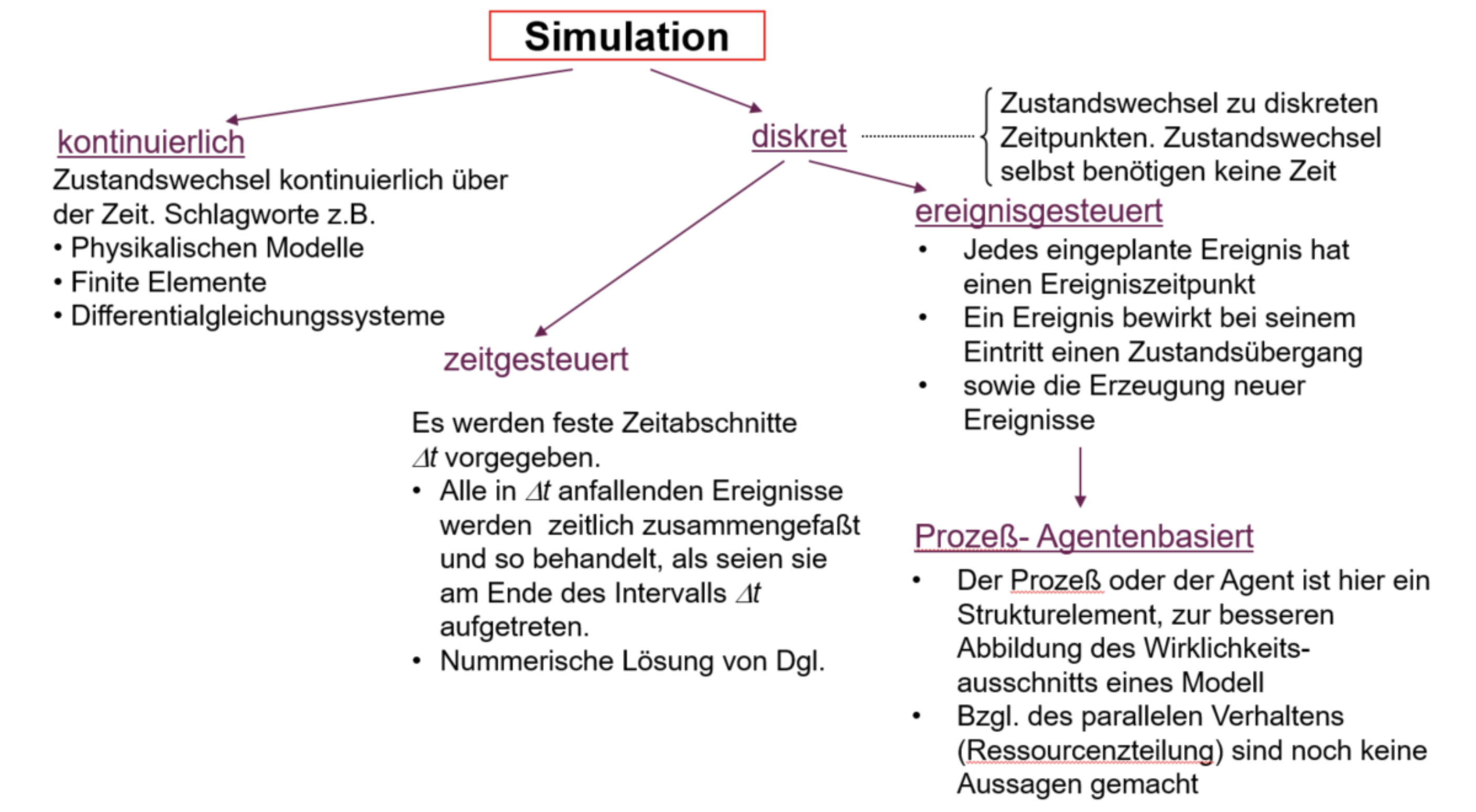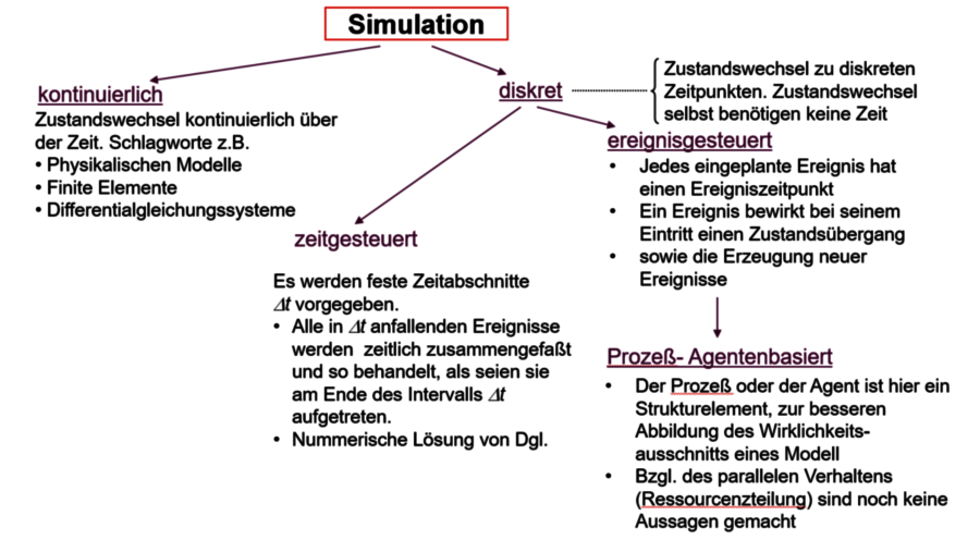Der diskreten Ereignissimulation (DES) liegt eine Systemsicht zugrunde, in der sich die Systemzustände nur zu bestimmten, diskreten Zeitpunkten oder Ereigniszeitpunkten ändern. Im Zusammenhang mit der DES werden oft Begriffe wie prozessorientiert, agentenbasiert oder schwarmorientiert genannt. Hierbei handelt es sich nicht um etwas grundlegend Neues, sondern nur um eine jeweils andere Modellsicht, in der der Prozess, der Agent oder der Schwarm als Strukturierungselement auftritt und damit lediglich den Modellbildungsansatz beeinflusst. Letztlich muss aber der zugrundeliegende Simulationskern das Simulationsgeschehen wieder in eine Ereigniskette auflösen.