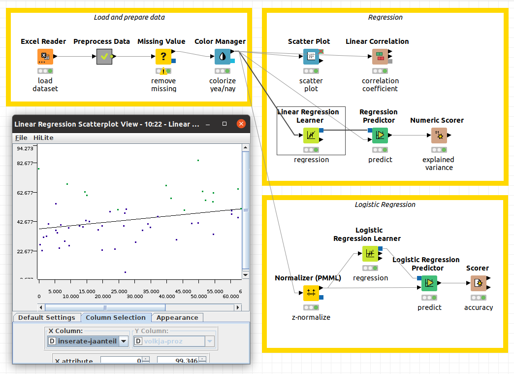 KNIME Analytics ist eine frei verfügbare Software für Datenanalyse. Mit KNIME ist es sehr einfach möglich, ohne Programmierkenntnisse Daten zu analysieren und dabei sowohl den Prozess der Analyse im Überblick zu behalten, als auch Details zu den Zwischenschritten sichtbar zu machen. Für KNIME gibt es sehr viel für die Statistik und Datenanalyse nützliche Komponenten: Von einfachen Visualisierungen wie Histogrammen und Boxplots zu statistischen Hypothesentests bis hin zu Machine Learning ist alles dabei.