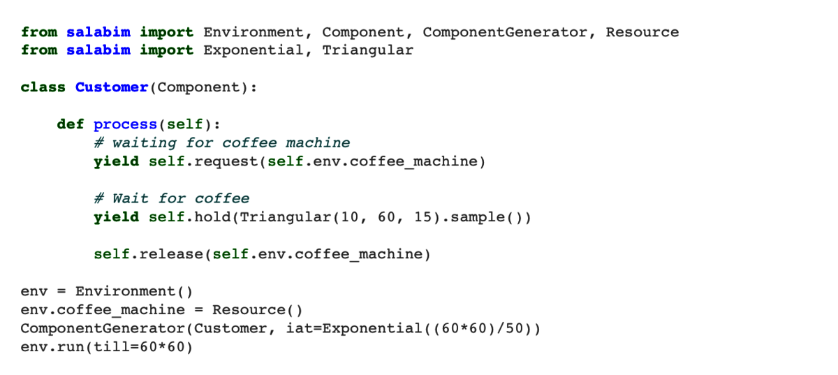 Das Beispiel simuliert das Anstehen an einer Kaffeemaschine. Es gibt einen Prozess (Customer), welcher das Verhalten eines Kunden modelliert: Anstehen vor der Kaffeemaschine und warten bis diese frei wird, anschliessend Kaffezubereitung mit einer zufälligen, triangular-verteilten Wartezeit. Kunden werden über eine spezielle Komponente (ComponentGenerator) exponentiell-verteilt der Simulation hinzugefügt.