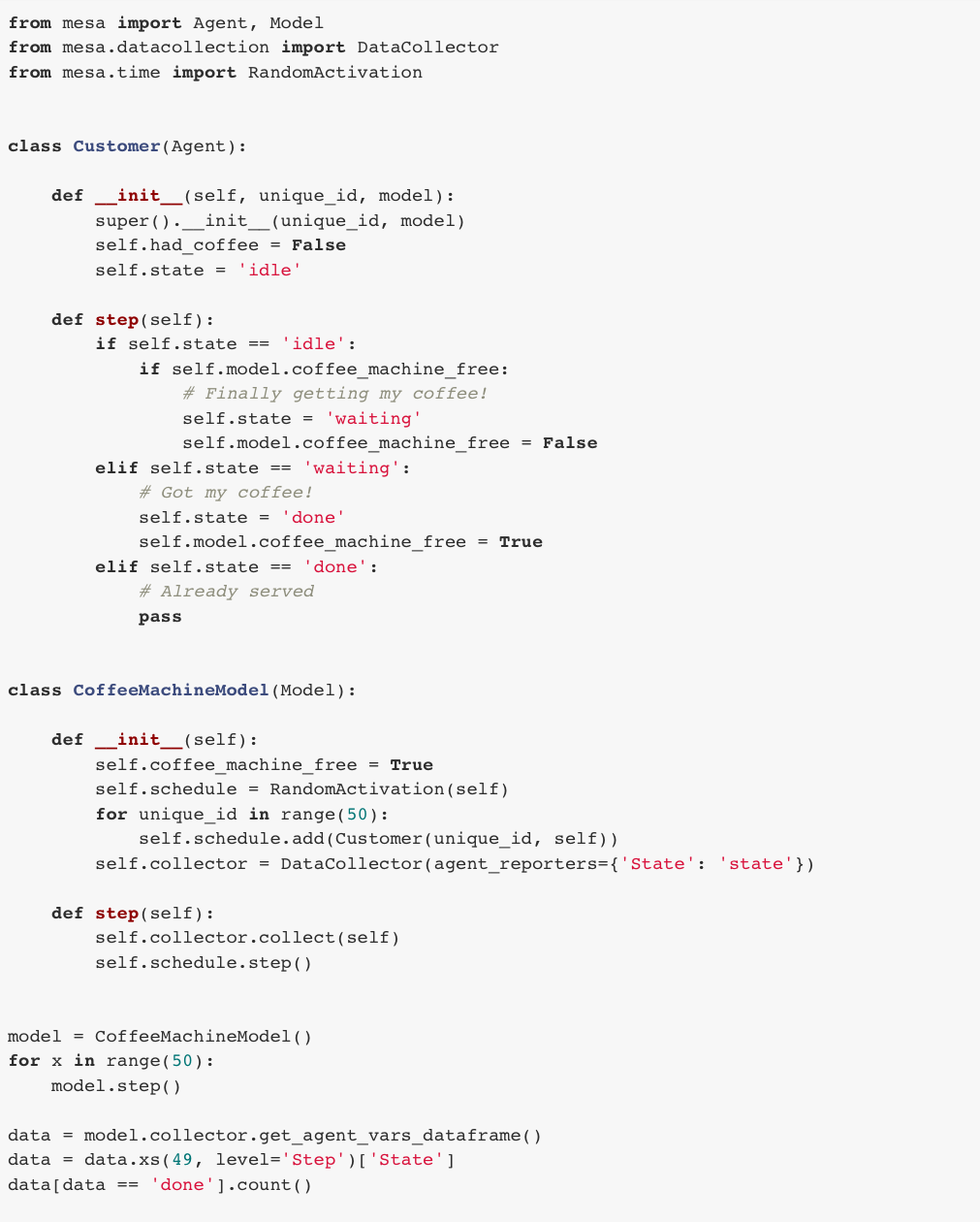 Das Beispiel simuliert das ungeordnete Anstehen an einer Kaffeemaschine. Das Modell hat 50 Kunden, welche jeweils überprüfen, ob die Kaffemaschine frei ist und sich gegebenenfalls eine Kaffee entnehmen und die Maschine wieder freigeben. Die Reihenfolge der Kunden bei jedem Schritt ist zufällig. Bei jedem Schritt werden die Zustände der Kunden erfasst. Es werden 50 Schritte simuliert.