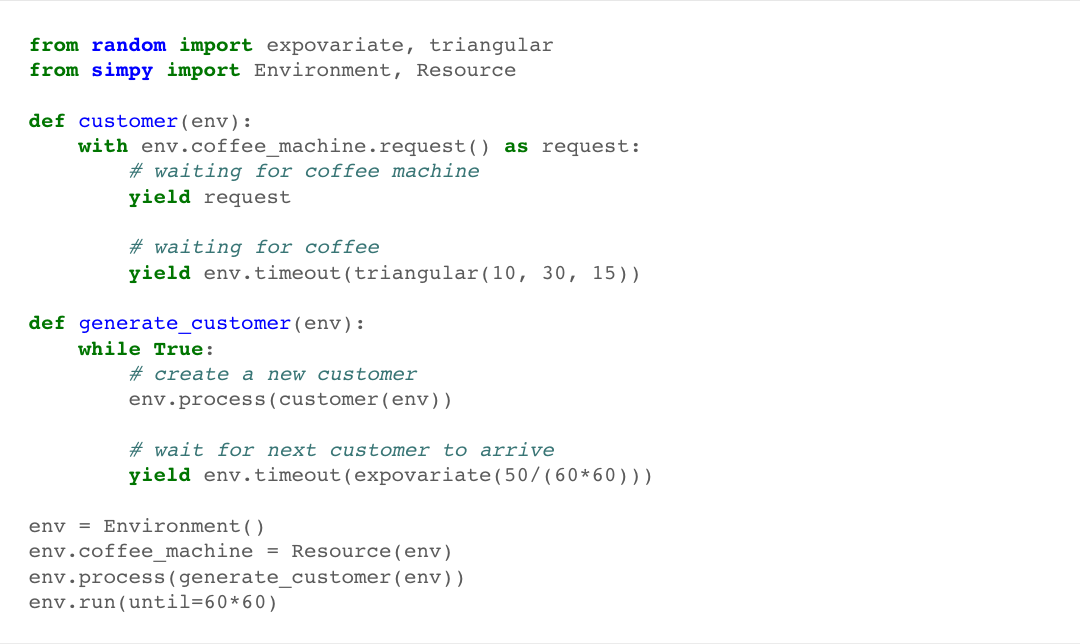 Das Beispiel simuliert das Anstehen an einer Kaffeemaschine. Die Simulation hat zwei Prozesse: customerund generate_customer.