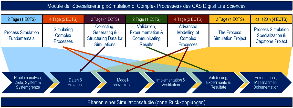 Abbildung 1: Die Module der Spezialisierung «Simulation of Complex Processes» des neuen CAS in Digital Life Sciences (oben) thematisieren alle Kompetenzen, die in den Phasen einer typischen Simulationsstudie (unten) benötigt werden. Die Pfeile (orange, violett, grün und rot) und Flächen (blau und gelb) zeigen, auf welche Projektphasen die spezialisierten Module stärker abzielen.