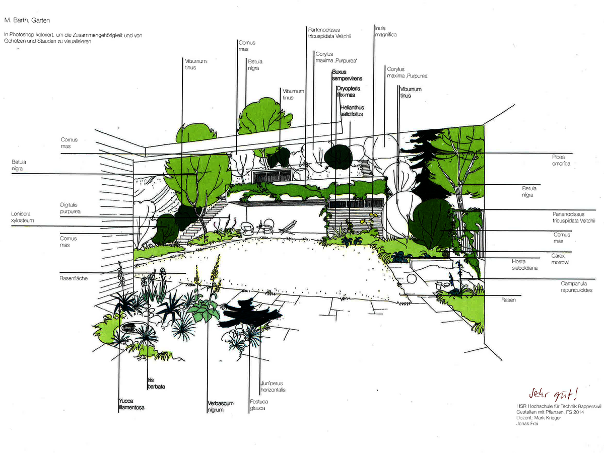 Zwei Übungen in diesem Modul beschäftigen sich mit historischen Plänen. Darstellungen von Hans Jakob Barth und Johannes Schweizer zeigen Pflanzen in so präziser Art, dass sie sich mindestens annähernd bestimmen lassen. Die Studierenden versuchen beispielsweise in der Zeichnung eines Innenhofes von Barth die Pflanzen zu bestimmen und so eine realitätsnahe Vorstellung einer Bepflanzung aus der Zeit der Nachkriegsmoderne zu entwickeln. Basierend auf solchen Studien entwerfen sie dann eine eigene Pflanzplanung, die vom studierten Vorbild inspiriert ist.