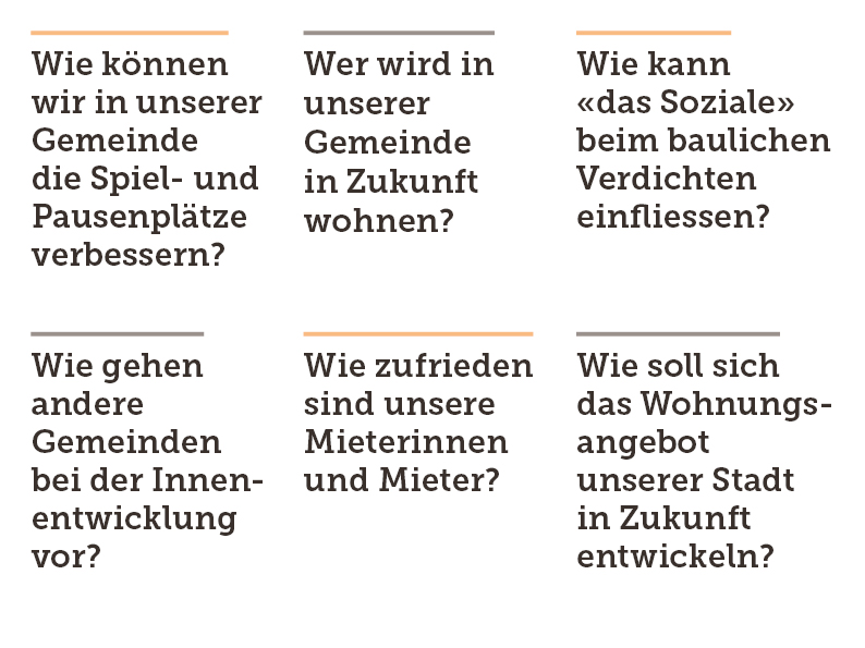 - Wir analysieren sozialräumliche Zusammenhänge, zum Beispiel: Wie ist die aktuelle Wohn- und Arbeitssituation in der Gemeinde? Wie können Freiräume in Siedlungen kinder- oder altersgerecht entwickelt werden? Worauf sind Nutzungskonflikte in öffentlichen Räumen zurückzuführen?