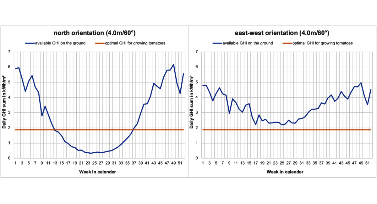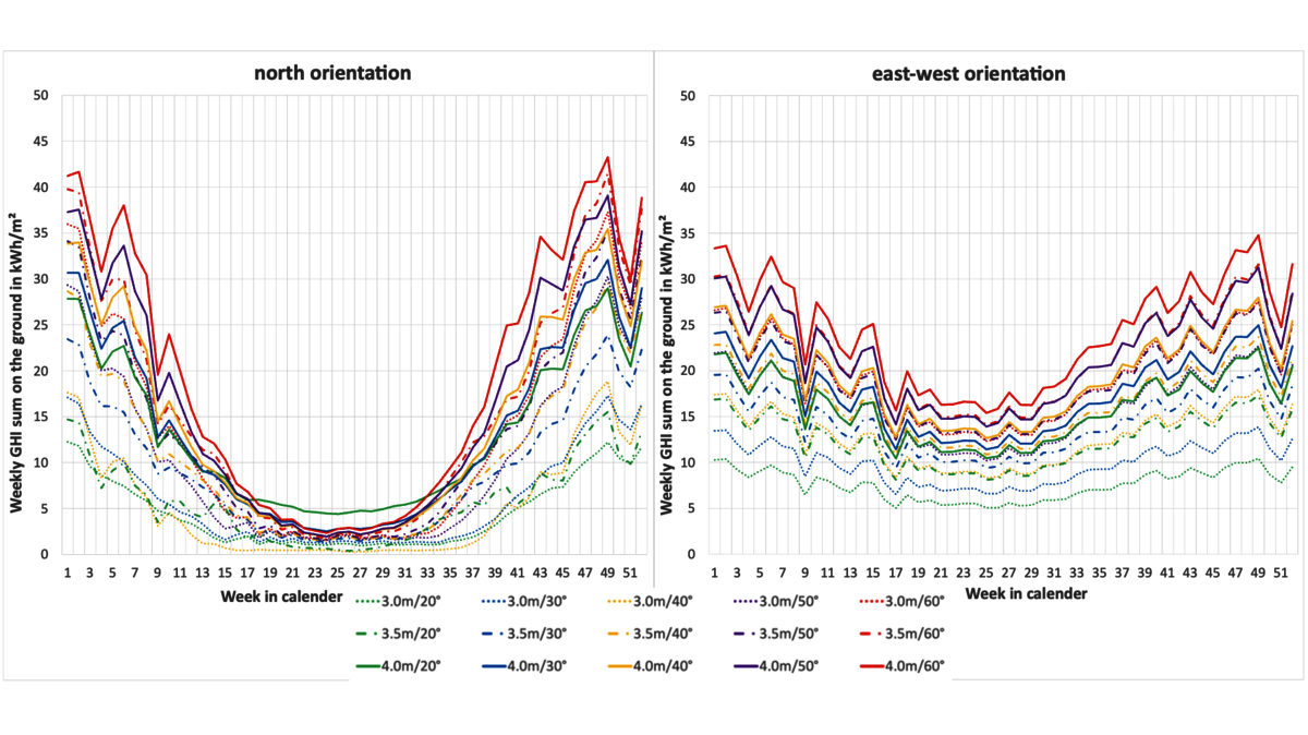Simulationen in PVSyst, für mechanische Konstruktionen mit unterschiedlichen Ausrichtungen, zeigten eine bemerkenswerte Diskrepanz, zwischen einer Nord- und einer Ost-West-Ausrichtung, bei unterschiedlichen Reihenabständen (3 m bis 4 m) und Neigungswinkeln (20° bis 60°) des PVP (Abb. 2). Die Simulationen wurden für Marikana, Südafrika, durchgeführt und zeigen, dass eine Ausrichtung des PVP in Ost-West-Richtung eine gleichmässigere Verteilung der globalen horizontalen Einstrahlung (GHI) ermöglicht und die Wachstumsbedingungen, insbesondere in den südafrikanischen Wintermonaten, aufgrund ausreichend hoher GHI-Werte verbessert (Abb.3). Im Gegensatz dazu führt eine nördliche Ausrichtung zu einem etwas höheren Energieertrag über das Jahr hinweg. Dies kann jedoch aufgrund einer ungleichmässigen Verteilung der Strahlung über das Jahr, insbesondere in den Wintermonaten, zu Ertragseinbussen für die Pflanzen führen (Abb.3). Ausserdem ist der Anteil der direkten Normalstrahlung (DNI) minimal, insbesondere in den Wintermonaten, wenn auch niedrige GHI-Werte zu beobachten sind. Der Temperaturunterschied unter dem beschatteten PVP führt nur zu einer leichten Verringerung der Bodentemperatur im Vergleich zu einem offenen Feld. Es kann festgestellt werden, dass die durchschnittliche Tagestemperatur der Pflanzen im Schatten aufgrund der ausreichenden Luftzirkulation keine signifikante Abweichung von der unbeschatteten Situation aufweist. Folglich sind die Wachstumsraten im Vergleich zu einem offenen Feld sehr ähnlich. Die Wirtschaftlichkeit einer APV-Anlage ist durch die ins öffentliche Netz eingespeiste Energie in der Regel gewährleistet, so dass mögliche Ertragseinbussen in der Landwirtschaft mehr als kompensiert werden. Es ist zu beachten, dass die Luftverschmutzung durch nahegelegene Platinminen und Holzverbrennung den GHI-Wert verringern und damit die Erträge beeinflussen kann.