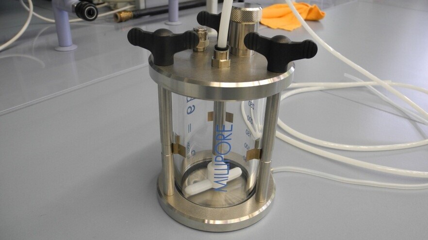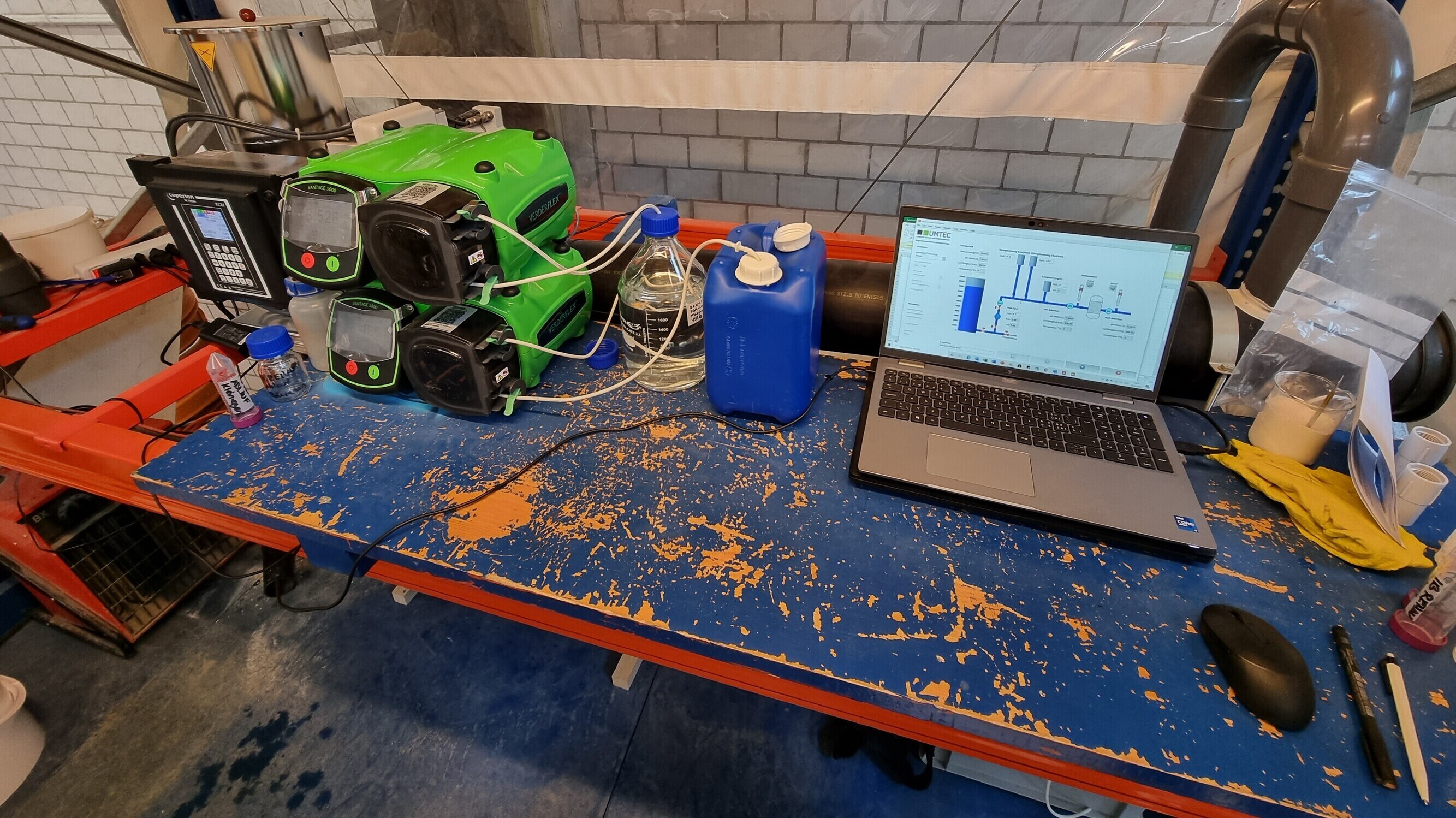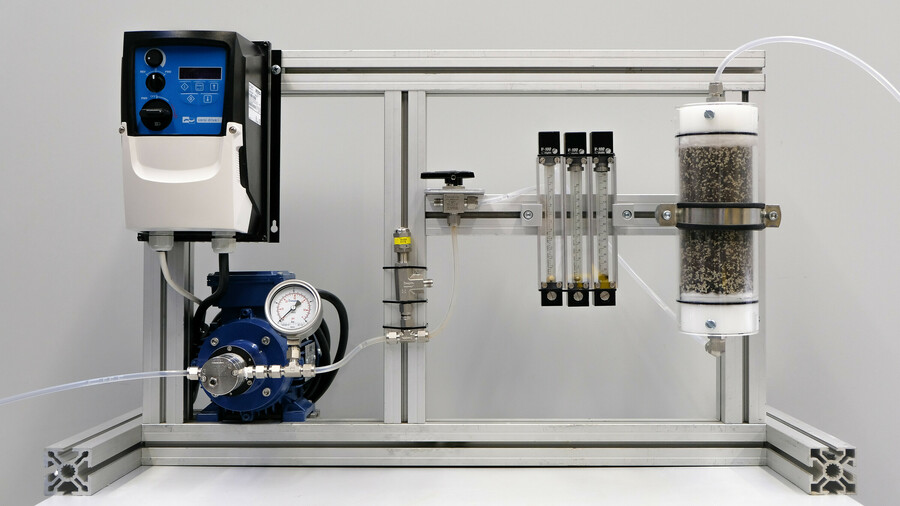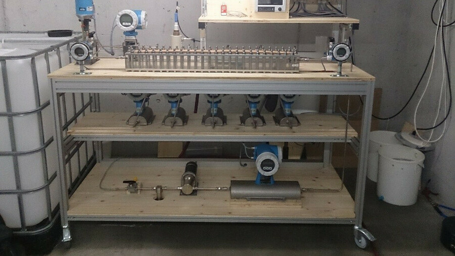 Im Membran-Teststand, einer Konstruktion in Anlehnung an die „Long Channel Membrane Test Cell“ (LCMTC) der TU Dresden, lassen sich Flach-Membranen zur Mikrofiltration bis hin zur Umkehrosmose mit den dazugehörigen Spacern auf das Fouling-Verhalten untersuchen. Eine Besonderheit ist, dass das Permeat über fünf hydraulisch getrennte Segmente mit Coriolis-Messgeräten kontinuierlich separat erfasst werden kann