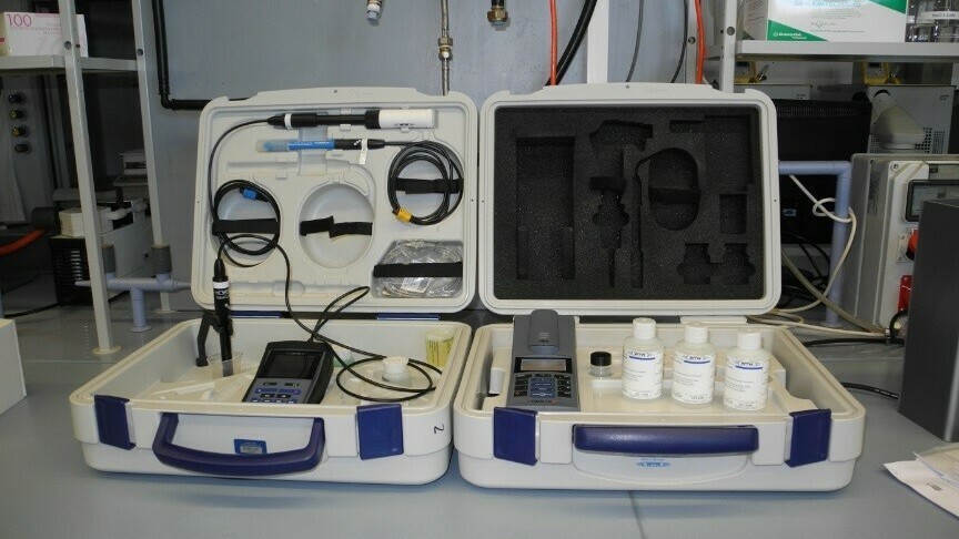 Mit dem Photometer lassen sich verschiedene gelöste Wasserinhaltsstoffe, zum Beispiel Chlorid (Cl-), Ammonium (NH4+), Nitrat (NO3-), Nitrit (NO2-), Phosphat (PO43-), Sulfat (SO42-), Schwermetallionen und Farbstoffe, aber auch die Trübung (FNU, NTU) in wässrigen Proben bestimmen. Das UMTEC verfügt über drei verschiedene Geräte.