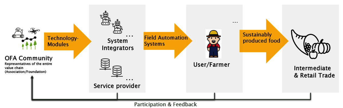 Die Module sind open-source und das Wissen ist für jeden ersichtlich. Systemhersteller implementieren die Module in neue Maschinen. Im Einsatzgebiet werden diese auf Nutzertauglichkeit getestet und laufend verbessert. Die Optimierungen und Neuerungen fliessen wieder in das OFA-Portfolio zurück.